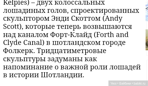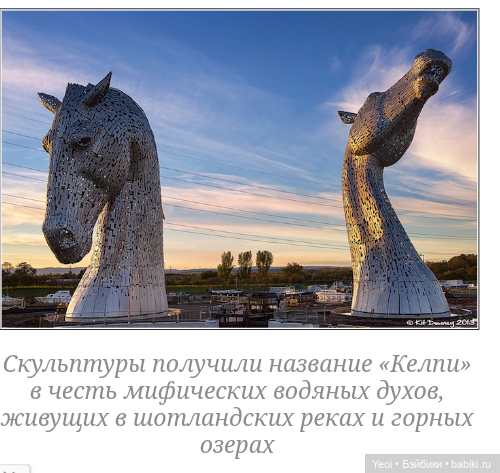 13. Келпи, Фалкирк, Шотландия. Тридцатиметровые скульптуры Энди Скотта задуманы как напоминание о важной роли лошадей в истории Шотландии. Две скульптуры высотой с десятиэтажное здание – визуальная доминанта эко-парка Хеликс. Скульптуры получили название «Келпи» в честь мифических водяных духов, живущих в шотландских реках и озерах, способных превращаться в разных животных, но чаще всего принимающих обличье коня..