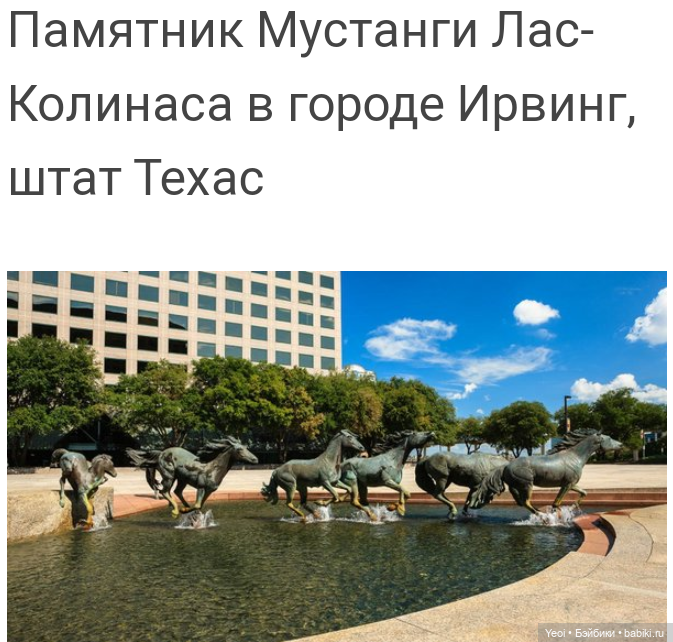 2. Мустанги Роберта Глена, Лас-Колинас, Техас, США. Основная идея скульптуры — передать движущую силу, инициативу и раскрепощённый дух, которые были присущи Техасу в период его освоения.