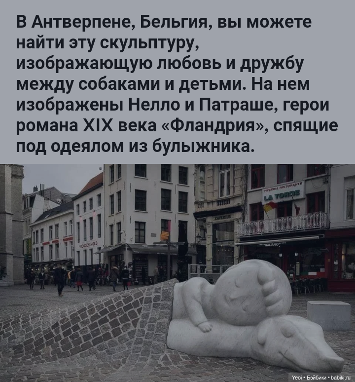 16. Памятник Нелло и Патрашу в Антверпене (Бельгия) посвящен событиям, описанным в романе «Фландрийский пес» английской писательницей Марией Луизой де ла Раме в 1872 году.