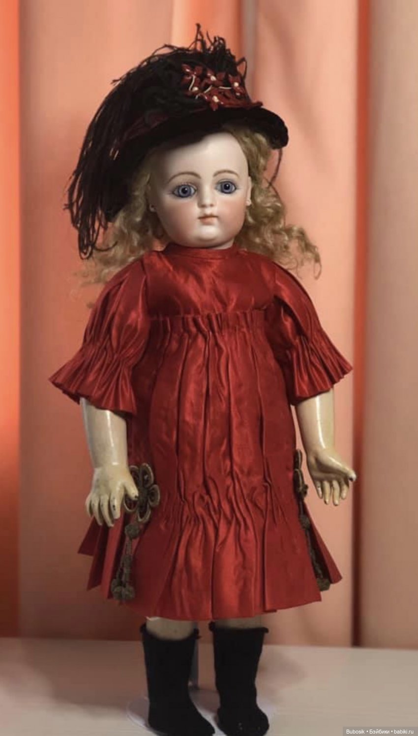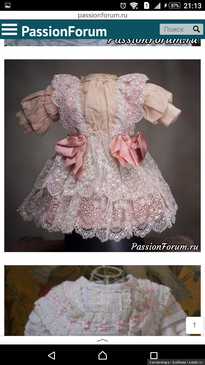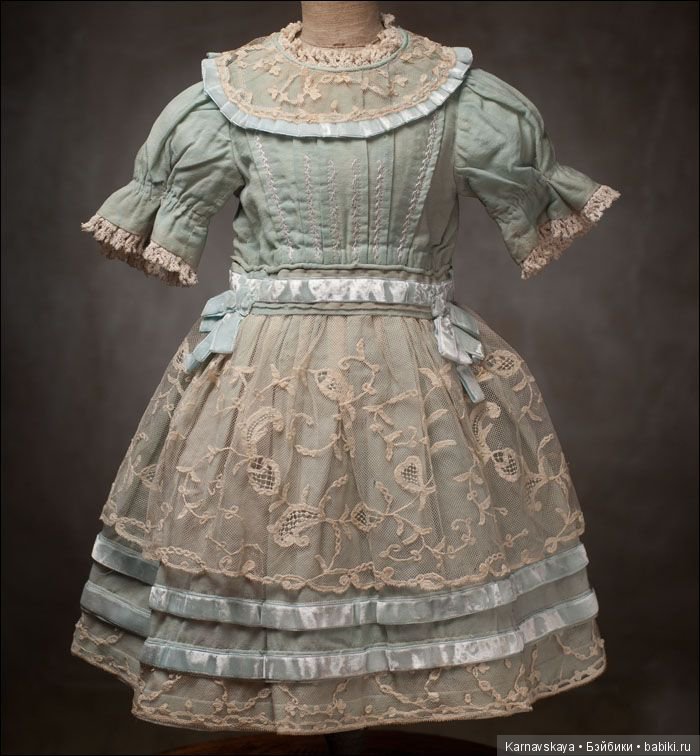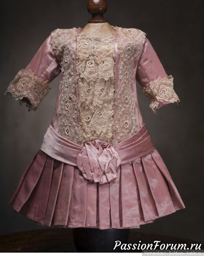 Сегодня дошила платье начатое две недели назад.Это попытка сшить реплику понравившегося антикварного платья(это платье на первом фото), фото платья нашла в инете, ну а шила долго по простой причине-не смогла найти подходящие атласные ленты для бантов, а их на платье аж целых пять, и на рукавах, и на лифе, и на подоле.Современные атласные ленты из полиэстера или нейлона категорически не подходили по причине уж очень сильного блеска, ничего подходящего раздобыть не получилось, сделала бантики из батиста -тоже не понравились, в итоге на бантики использовала кружево, что и для отделки, тонкую репсовую ленточку и цветочные тычинки.Платье получилось на прямой кокетке с завышенной талией и свободного покроя для кукол ростом 50 -55см.На фото его демонстрирует ФиБ ростом 55см.Платье сшито из тонкой хлопковой ткани типа батиста, ткань из конца 70-х, начала 80-х, крепкая, без потерь, в идеальном состоянии.Кружево тоненькое, Европа, реплика антикварного ,100%хлопок, его ушло в общей сложность пять метров, швы прямострочные и мелкий зигзаг, горловина регулируется кулиской, петельки прорезные с ручной обметкой, обметка лифа, юбки, кружев на руках, вообще ручной работы много.Цвет ткани лососевый, нежный и не яркий, кружева-нежный цвет топленого молока, цветовая гамма ткани и кружева сочетается идеально.Конечно, сделать один в один не получилось, и дело не только в атласных ленточка для бантиков.Антикварное платье вероятнее всего сшито или из плотного шелка или атласа, на фото заметен небольшой блеск ткани, а я шила из тонкого хлопка, да и антикварное кружево, это антикварное кружево, его полноценно не заменить.Но все же, на мой взгляд платье получилось интересное, такой фасон встречается редко, кукле оно идет и готовая работа меня порадовала))).