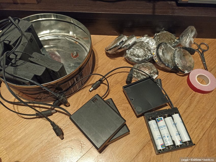 Смонтировали двухметровые светодиодные ленты с блоками питания, работающими от пальчиковых аккумуляторов или батареек.