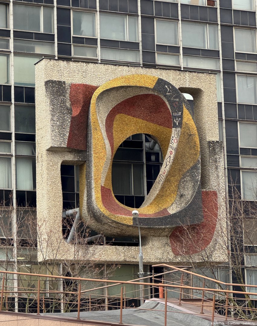 «Архитектор Леонид Павлов хотел придать Центральному экономико-математическому институту какой-то яркий акцент, связанный с назначением здания. Так на фасаде в 1976 году появился бетонный рельеф, покрытый мозаикой и выступающий на шесть метров над плоскостью стены. Художники Элеонора Жаренова и Владимир Васильцов изобразили символ бесконечности — ленту Мебиуса. Но народн увидел в ней другой символ и окрестил здание «Дом с ухом».»