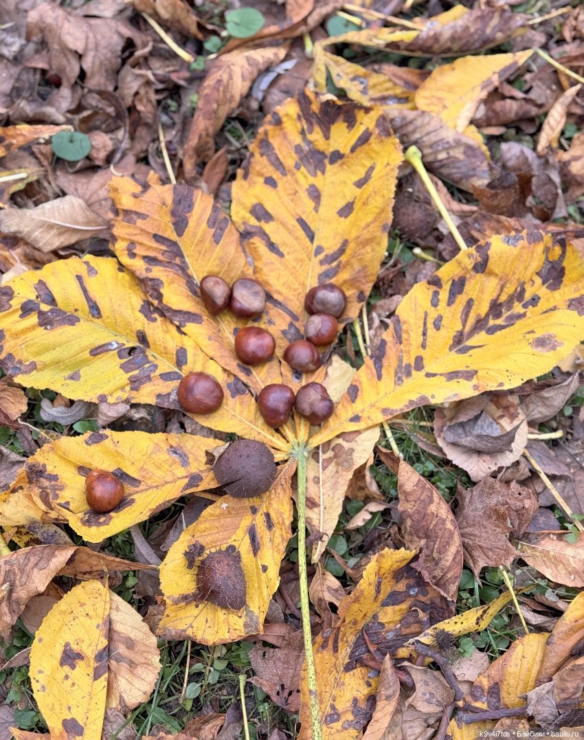 Эта поездка в Москву по делам была 10 ноября. Со мной была Фрейя.Погуляли в парке, где растут каштаны. Каштаны созрели и валялись среди опавшей листвы.