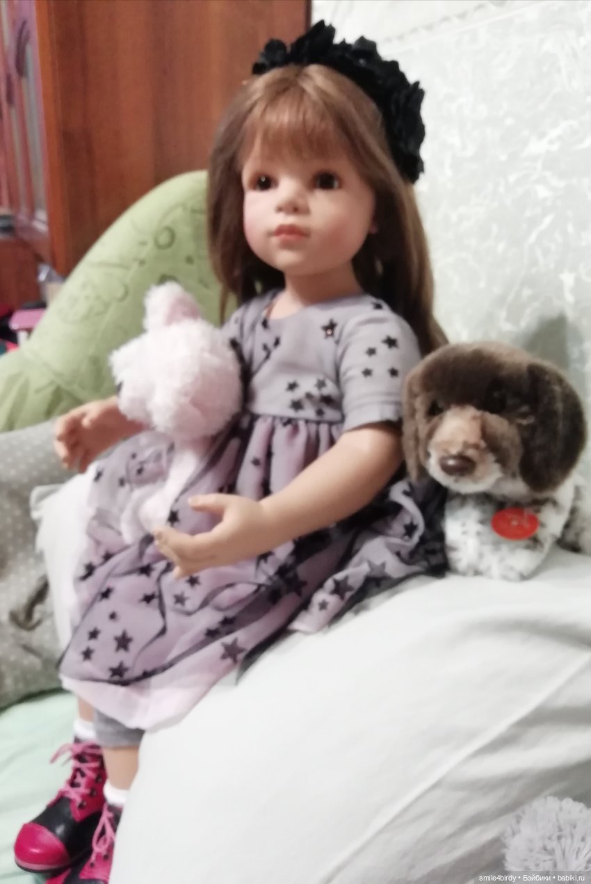 Хотела поговорить с вами о куклах немецкой фабрики Schildkrot. Точнее о куклах Зиглинде Фриске Sieglinde Frieske. Осенью прошлого года попалась мне на глаза реклама куколки с очень милым личиком. Вообще-то, до той поры меня привлекали в бОльшей степени куклы бжд. Но любопытства ради прошла по ссылке и… это была любовь с первого взгляда (уверена, большинство из вас знает о чём я говорю!): премилое личико, красивый аутфит, да ещё и милый питомец в комплекте! И началось усиленное накопление капитала с целью последующего приобретения желанной куклы. И вот сумма накоплена, кукла заказана и даже куплена! Казалось бы, доставай из коробки, да радуйся… но не тут-то было… Достав из коробки куклу, расправляя одежду, в том числе и красивый шарф-снуд, с ужасом увидела чёрные пятна на подбородке и на шее спереди и сзади. Позвонила в магазин, объяснила ситуации. Куклу забрали… Погоревала пару дней, и снова принялась за поиски. Нашла в ещё одном интернет-магазине. Заказала… та же ерунда. Причём заказывала дважды: один раз привезли куклу с чёрными пятнами (от того же аутфита!) на руках, другой – с огромным пятном на шее… Но я же не стала меньше хотеть поселить у себя именно такую Алину! Продолжила поиски по магазинам Москвы – пусть дороже, но зато уж лично удостоверюсь перед покупкой. Нашла – поехала… не купила по той же причине. Мониторю интернет – ага, есть ещё одна в Москве. Приезжаю – и у этой тоже есть пятнышки, но не такие ярко выраженные. Но цена!.. Скрепя сердце и стиснув зубы, возвращаю куклу продавцам и гордо выхожу из магазина…Ну зачем мне кукла с пятнами по цене…ну, в общем, совсем не дешёвой?! Горюю пару дней… И тут вдруг приходит уведомление из магазина о распродаже (в т.ч. и на кукол)! Ну тут уж «не вынесла душа поэта» — помчалась в магазин и купила таки ЕЁ! с ПЯТОГО захода))) По привозу домой, злосчастный аутфит был сразу снят, и даже постиран, и убран в коробку (нафиг-нафиг). Куплена новая (детская) одежда, даже повезло подобрать обувь и колготы, подходящие по размеру))
