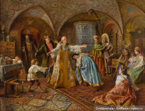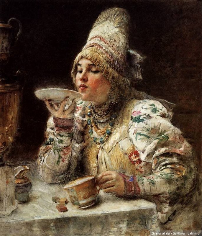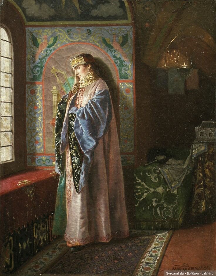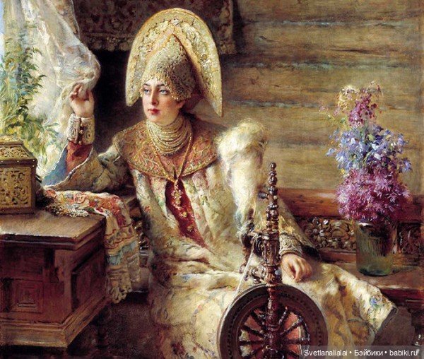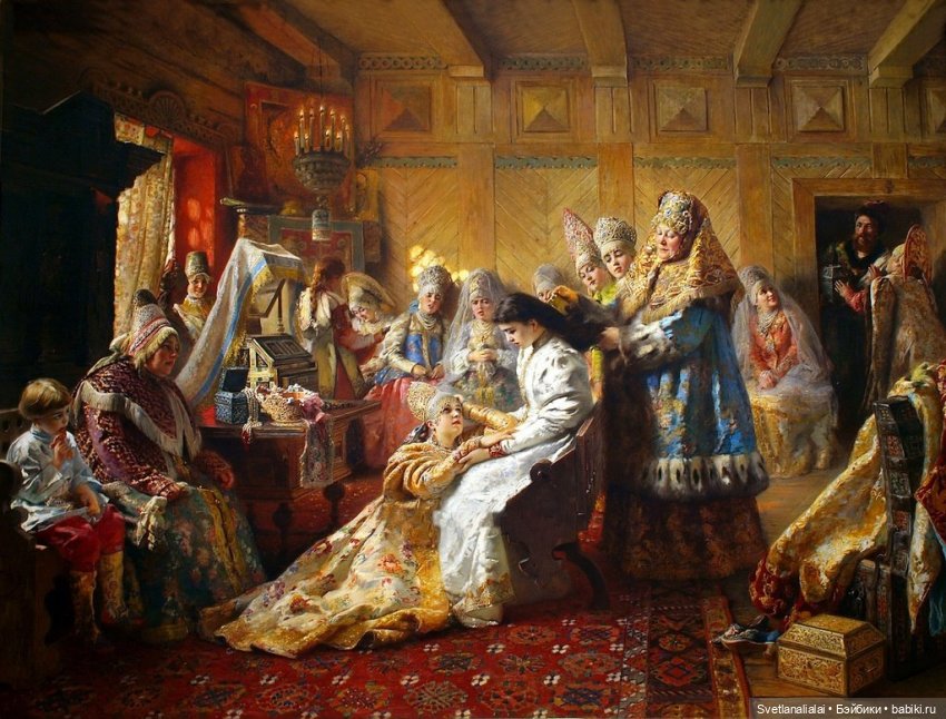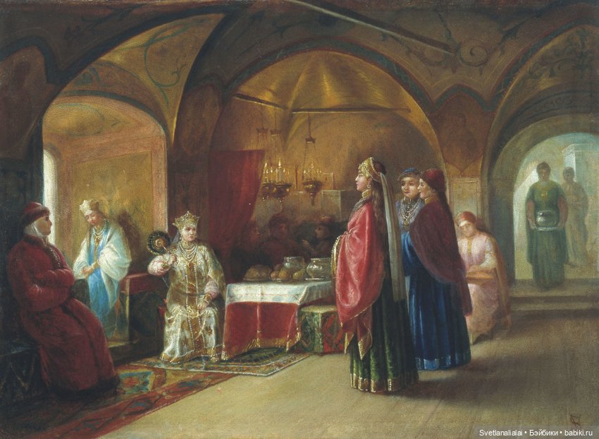 Трапезы и чаепития сменяли друг друга, а в часы отдыха боярыня и княжна занимались рукоделием и перебиранием приданного: венцов девичьих, тканей заморских — парчовых и бархатных, каменьев самоцветных и украшений дорогих.