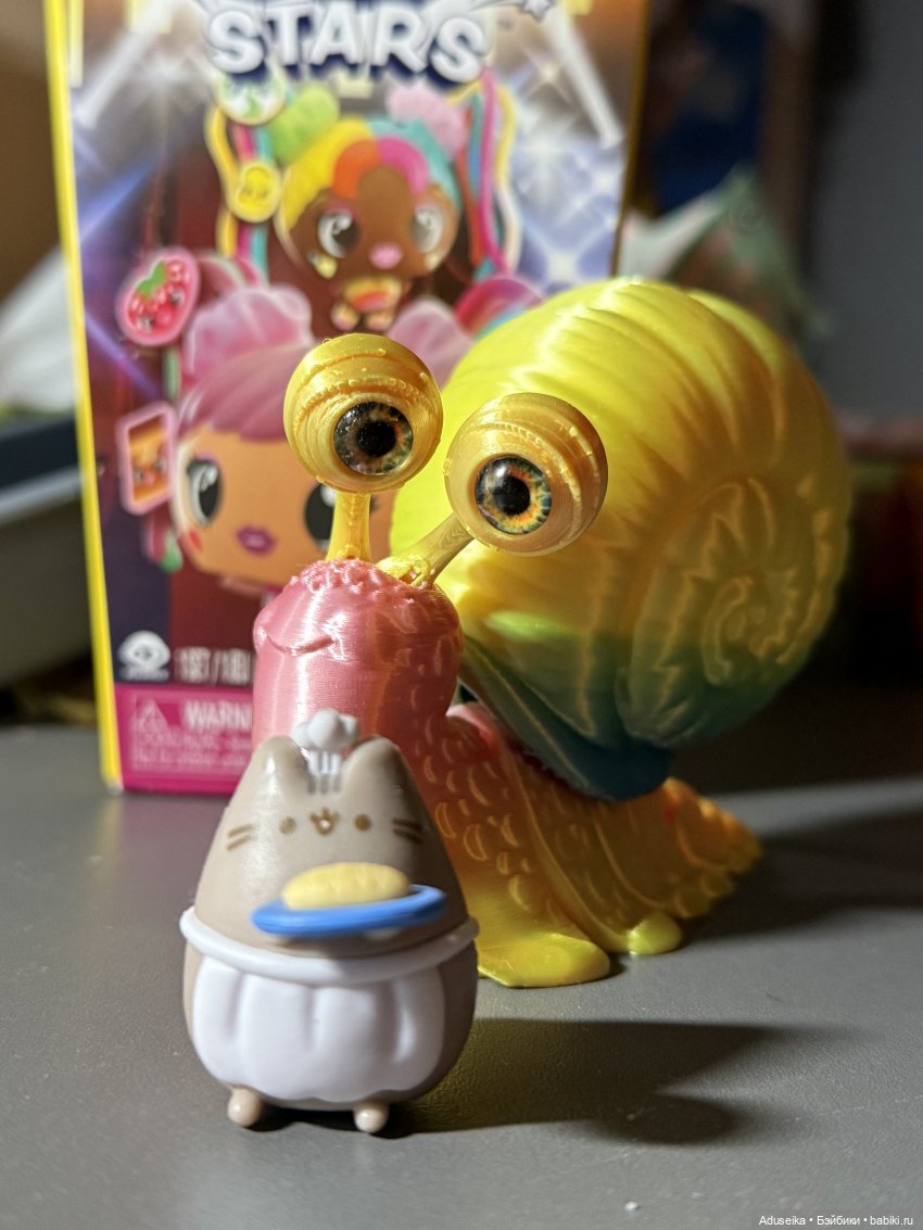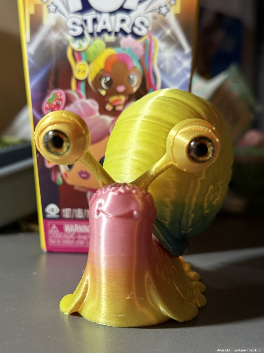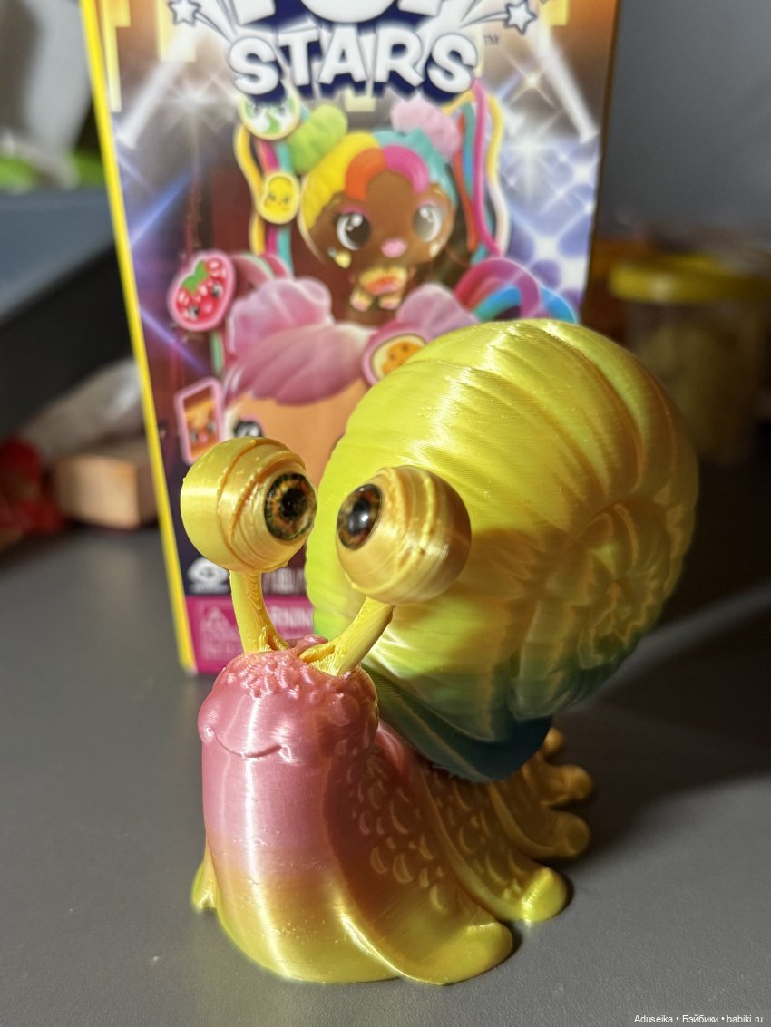 Нашла😅 вариант номер раз. Шарнирная «3д принтерная» яркая улитка. Глаза на ножках, двигаются смешно. Хотя размерчик я и недооценила, но они нашли общий язык (по цвету гармонируют ихмо).