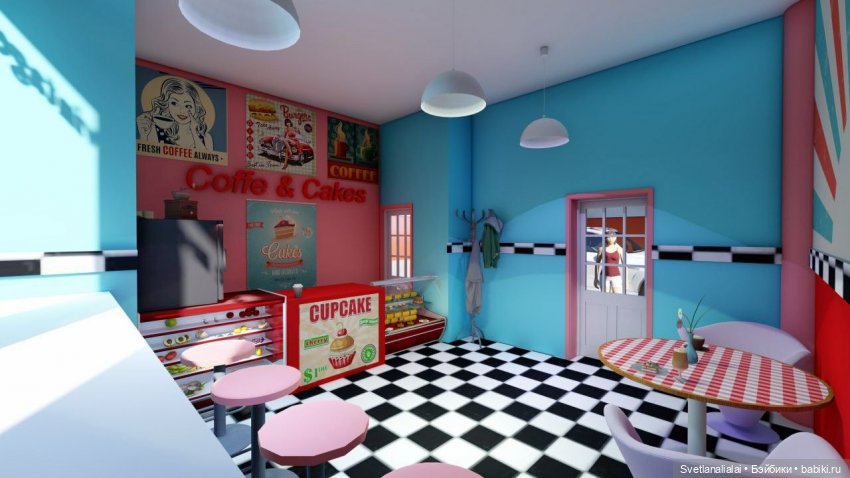 Но в действительности кафе задумывалось для Тамми и ее Синди-подруг! Тамми в платье с белым передником и туфельках была бы изумительной хозяйкой, а Венди и Пэм — желанными гостями)))