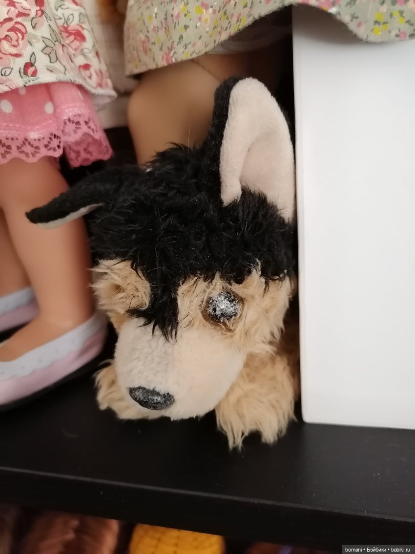 На последнем фото видно, кто живет с ней по соседству. В ноги прибился щенок, потеряшка. Нашла его в луже на улице, пройти мимо не смогла. Отстирала в машинке, причесала, как смогла. Еще бы глазки ему заменить, но тут уж я совсем не спец, к сожалению.
