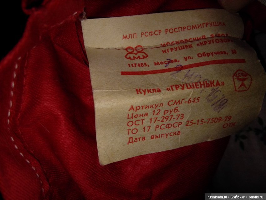 Такие куклы делали на Московской фабрике «Художественная игрушка» (она же — фабрика сувенирных и подарочных игрушек на ул. Щипок, 9). В СССР середины ХХ века было такое, когда одни и те же модели кукол делались на нескольких фабриках. Поэтому тут и Киев, и Москва. Например, есть прессопилочные малышки: одно и то же лицо, но разная обувь — и «Ленигрушка», и «Победа».
