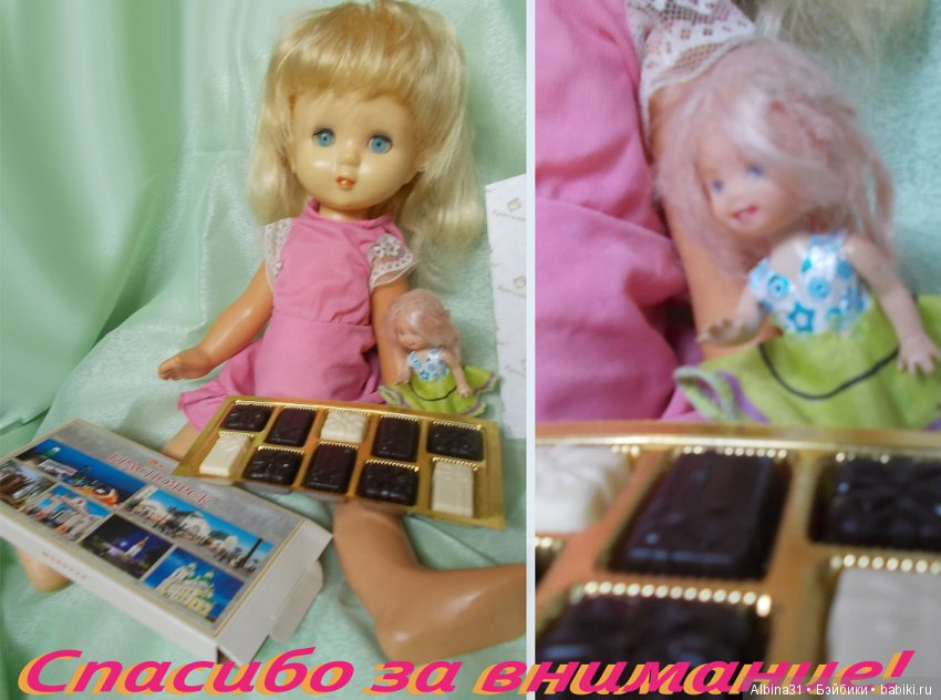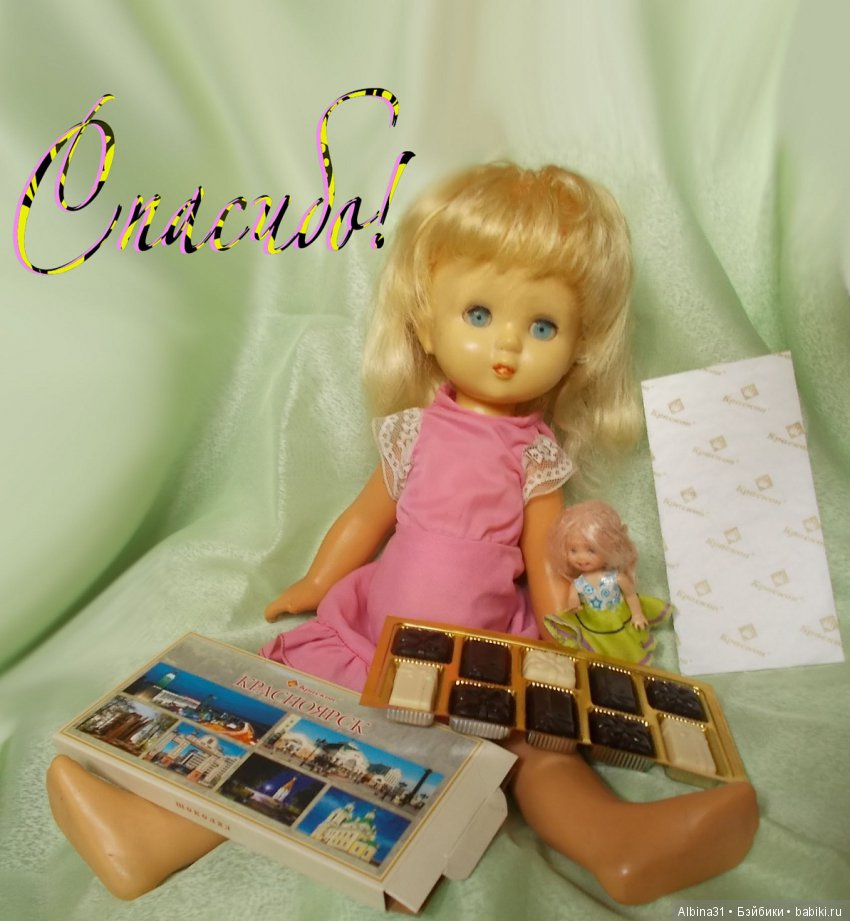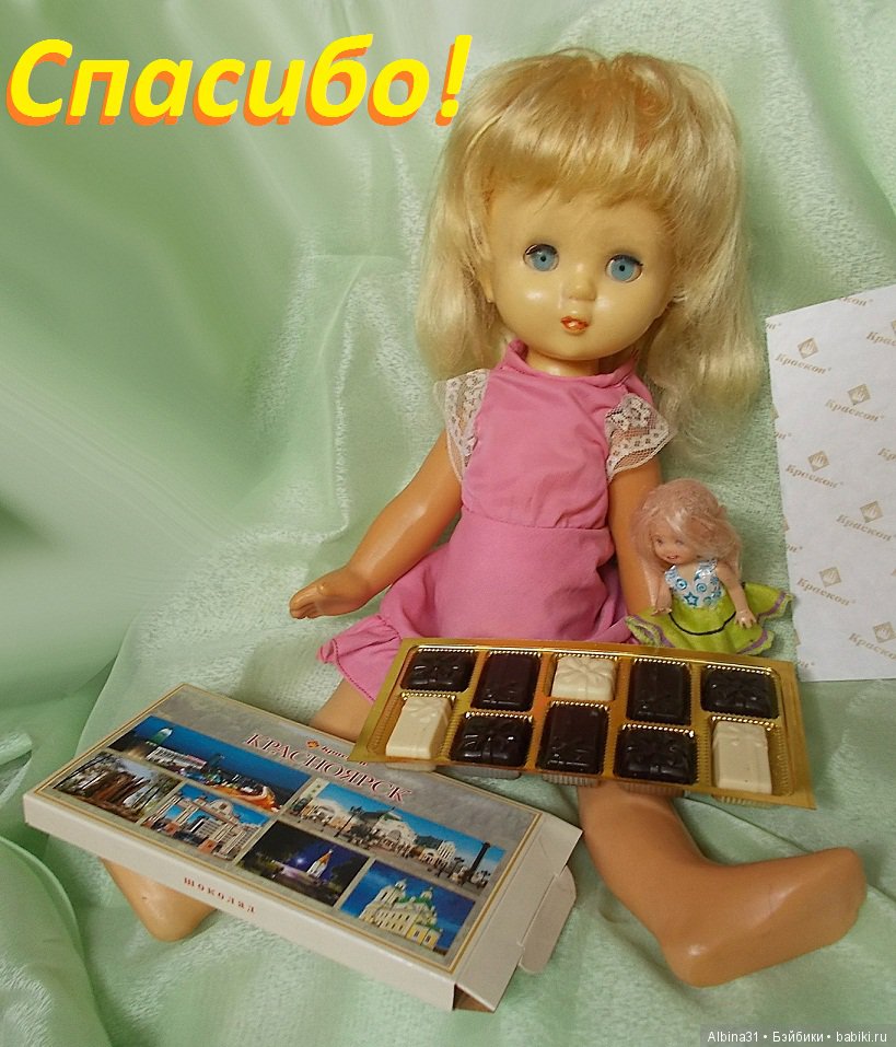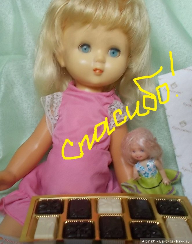 Да, Алёнка мне сразу понравилась в магазине, маму упрашивала купить… А когда настал этот день мы пришли в магазин, она долго выбирала, «мяуколки» проверяла, ну эти, что «мама» мяучат :))) Рассматривала лица, а для меня они все одинаковы прекрасными были :)))