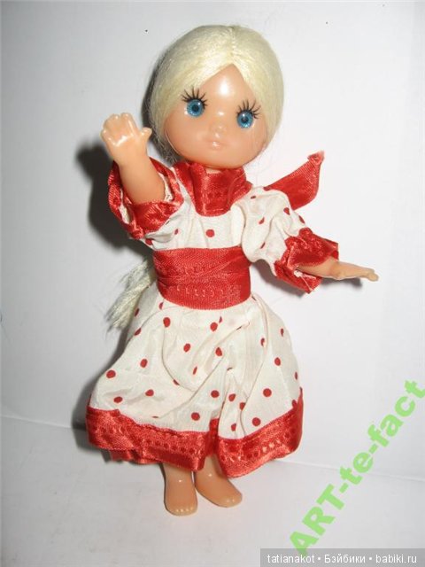 У нее тоже были белые косы, но не паричок, и она была миниатюрнее на фигурку и лицо. А родное платье было красное в белый горошек)