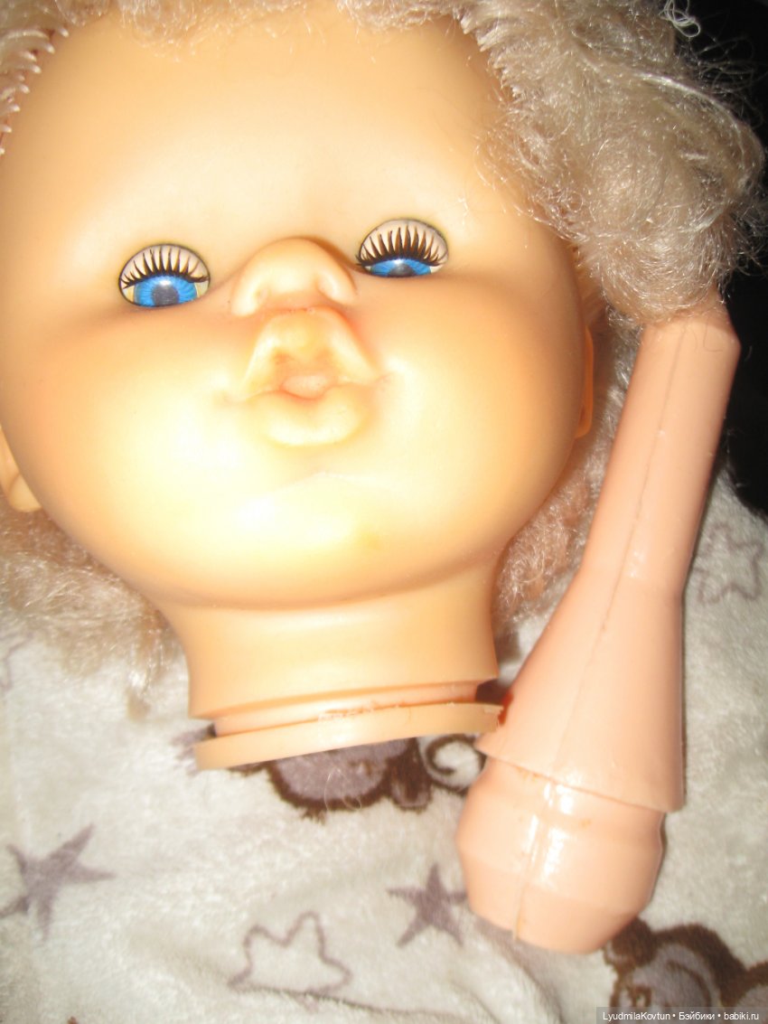 Эту куклу подарили моей двоюродной сестре в 1985 году, на её пятилетие))Кукла была по тем временам уникальная — огромная,70 см, с мягким телом, головой из резины и пластиковыми руками-ногами. Кукла была очень любимой, её наряжали, катали в коляске, кормили, даже разрезали ротик крест-накрест, чтобы можно было туда засунуть пустышку.Время шло, постепенно краски на личике выгорели, белки глаз пожелтели, реснички из пластмассы искрошились, а резина в месте крепления шеи к туловищу однажды лопнула — вероятно, маленькая дочка двоюродной сестры неудачно подняла большую, тяжёлую куклу за шею…