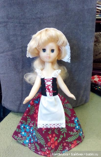 У меня в детстве такой не было — куклы не интересовали. Но вот только недавно её разглядела тут, на бэйбиках — она поразила своей трогательностью и нежностью. Не удержалась всё-таки и поселила у себя (старенькую; платьице всё ветхое было). Заказала у мастерицы Linia два наряда. Так что принимайте гостью)))