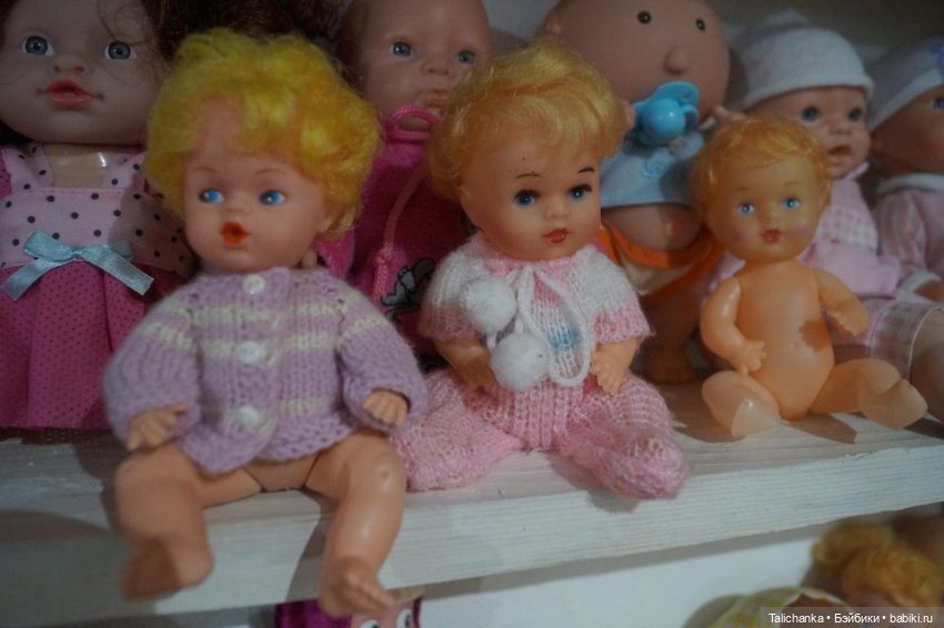 Ну и китайчата — не забываем, детство хозяйки кукол Насти пришлось на 90-е. Такие пупсики были и у нас сестрой. В вязаных бело-голубы- или бело-розовых комбенизонах. На поясе завязка, на горловине завязка. Надевались через горловину, надо было ножками засовывать. Были раздельные костюмчики в тех же цветах. Кофточки и ползуночки. Ещё помню плетёные шляпки были, попадались и такие. Шапочки с помпонами были. Ещё были со зверюшками резиновыми.