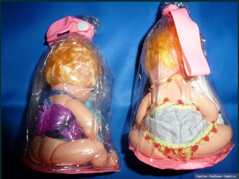 Я помню они в таких прозрачных пакетах тубах продавались из плотной но мягкой клеёнки. Синим или красным кантом прошиты. Затягивались сверху. Потом с бутылочками ещё такие пупсы продавались. У одной моей соседки с тарелочкой и ложечкой попался. Это было счастье! МЫ с девочками ходили в гости на это чудо глянуть! Вот свезло то!!! И пупсик и посудка!