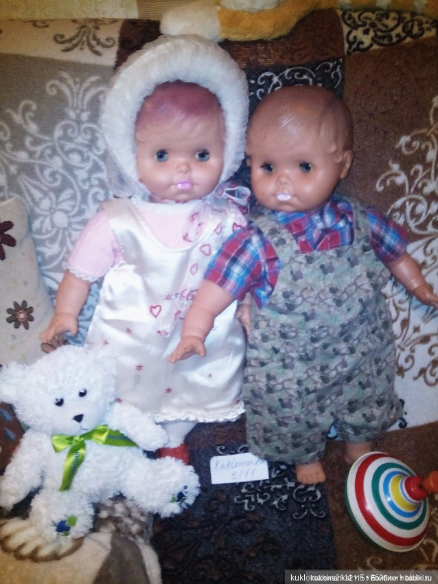 Здравствуйте, хочу познакомить вас с частичкой моей коллекции. Этого прелестного, 60-ти сантиметрового, мальчугана я случайно увидела на Авито, как обычно проводя свободное, и наполненное скукой, время в разделе игрушек. Своего Андрюшу я приобрела у очень немолодой женщины, которая сказала, что с данным пупсом играли ее внуки в детстве. Куклёныш мне достался в розовом, девчачьем одеянии. Тогда я и не знала, что это именно за кукла и каких времён, но мне почему-то очень захотелось заиметь себе в коллекцию этого харизматичного малыша. Придя домой и прошерстив хорошенько интернет я выяснила, что это пупс Андрюша Белорусской фабрики времён СССР. На Андрюше были небольшие следы времени, в виде стертых губок и пожелтевших белков глаз. Андрюша был постиран и высушен на балконе. Я слегка отреставрировала его глазки и ротик и нашла в магазине, подходящую ему на мой взгляд, одежку (благо сейчас есть самые разнообразные вещи на самых маленьких детей, так что подобрать не было проблемой). Теперь Андрюша стал красивым, нарядным — настоящим мальчуганом, и достойно пополнил мою коллекцию.