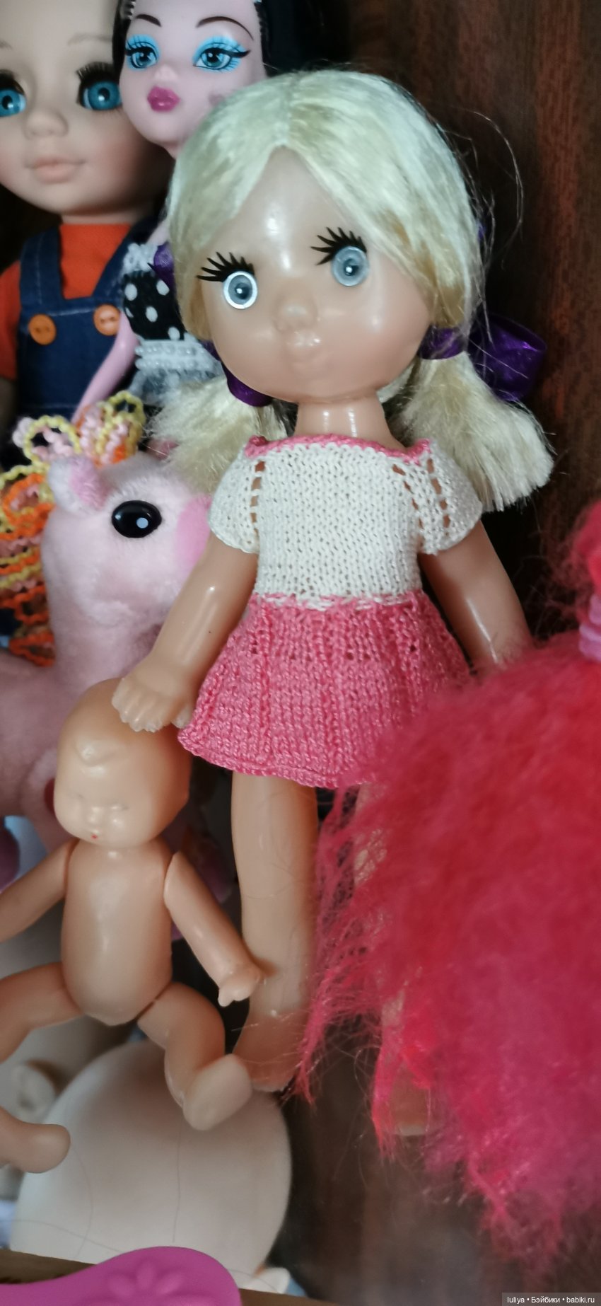 Эти малышки ростом 18 см. Голова не двигается. Ручки на резинках, ножки на винтах. Паричковые. Волоски сильно лезут(((. У рыженькой современные новые волоски. У куколки в голубом мейк фабричный. Платья и сапожки из ниток «Ирис».