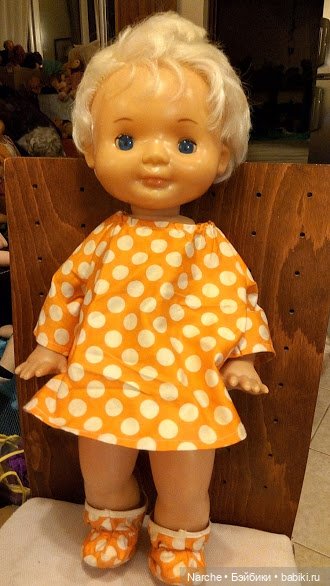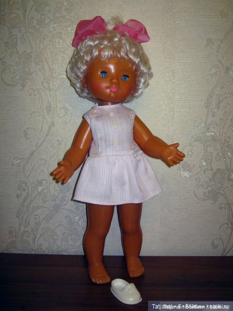 Мне кажется, в нашем детстве у нас в магазинах таких звёзд — как Марина, Нина, Наташа и других больших куколки даже и не было… Ассортимент кукол был бедный. Я даже витрин в магазинах с куклами не помню, хотя кукол любила. Только пупсики-столбики по 45 копеек запомнились, а так хотелось, чтобы и ручки, и ножки были подвижными. Так что я в поиске производителя моей миленькой куклёны.