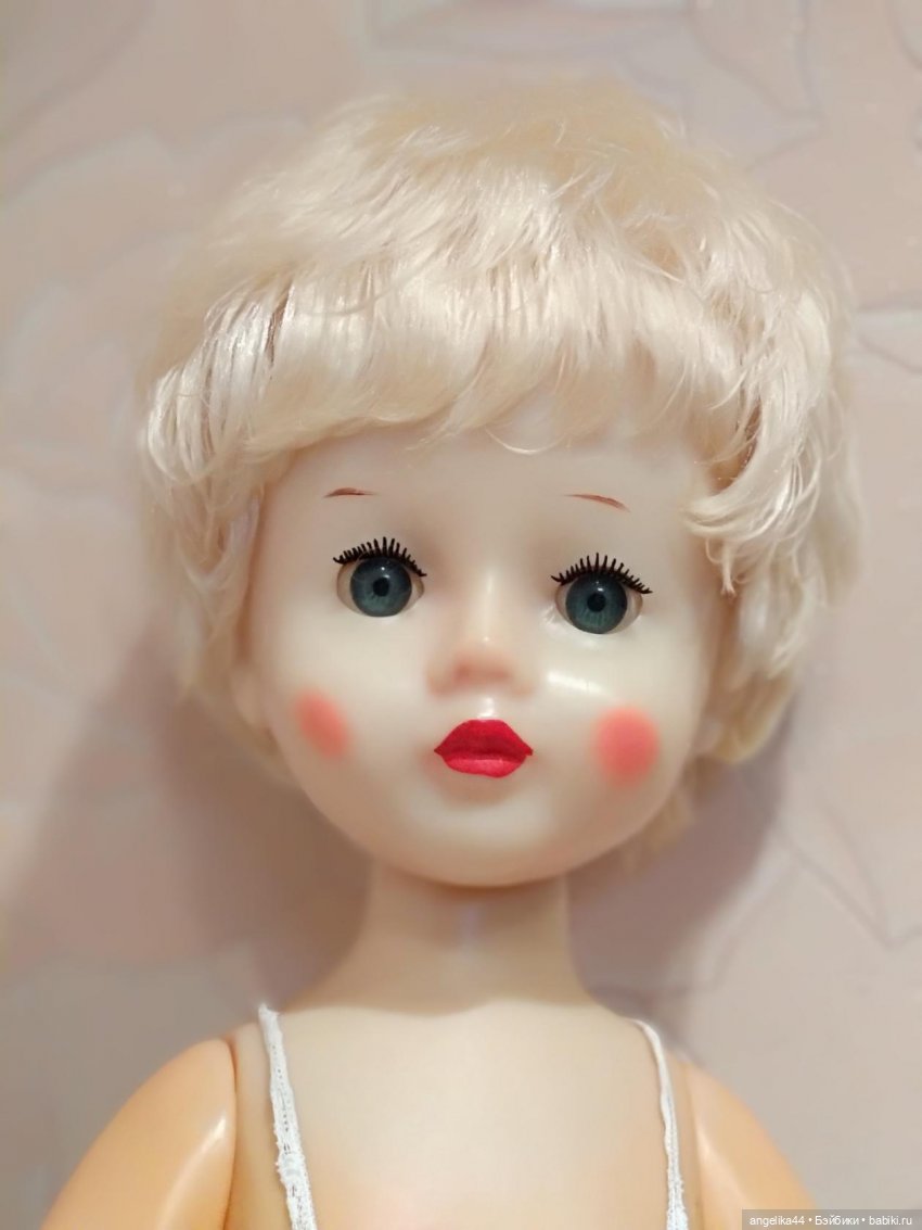 Перетянула куклу на новую резинку, она даже пытается ходить, но неуверенно. Волосы прошивать не решилась, купила парик. Акриловыми красками и пастельными карандашами восстановила макияж.