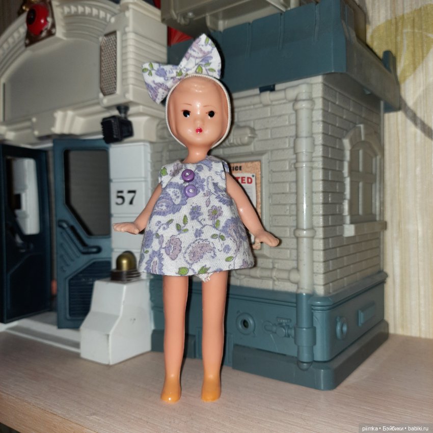 Эта куколка сразила меня наповал. Очень давно, еще лет в десять. Наша встреча состоялась весьма странно- куклу несли на помойку. Моя старинная и задушевная подружка, с которой, кстати, мы дружим до сих пор, тащила ее выкидывать вместе с другими ненужными вещами-у куклы не было одной ножки. Да и вообще-подружка куклами не увлекалась. Поэтому охотно отдала куклу мне. Я потом подарила ей классного медведя- и человеку приятно и медведь у нее живет до сих пор). Куколка меня потрясла. Не большая и не маленькая, с замечательной осанкой и пропорциональной фигуркой. В сиреневой капроновой юбочке-«солнце», белом купальничке (кто тогда знал слово «боди»)))))))), в сиреневом колпачке-«колокольчике»на головке… Все было приклеено, но это же ерунда… Так у меня появилась Оленька. Родители отнеслись с пониманием (они всегда разделяли и разделяют мои «завиральные идеи»). Отец раздобыл недостающую ножку (если приглядеться, разнотон виден и теперь), мама помогла аккуратно отмочить приклеенную одежду…