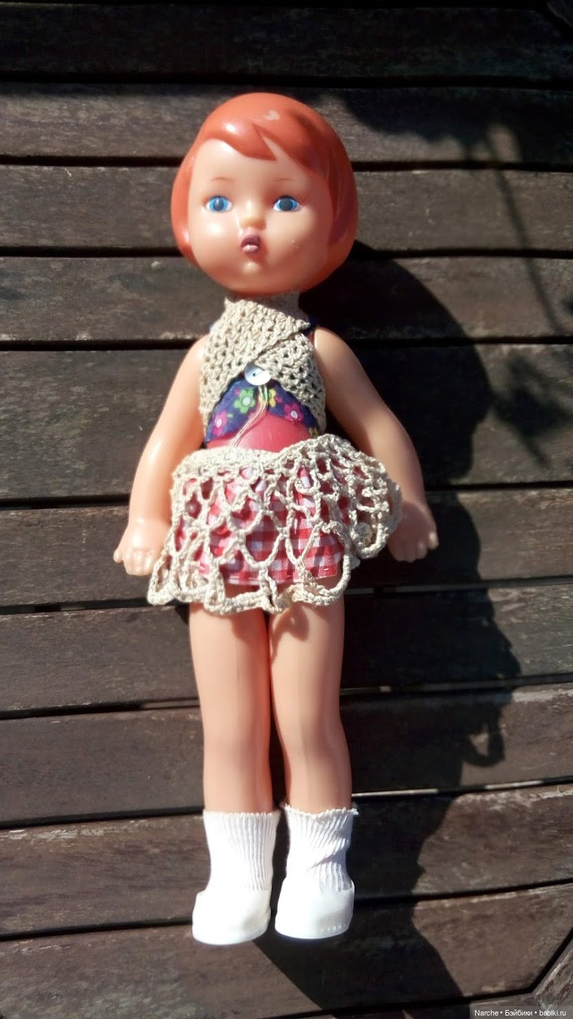 Девочка мне досталась в родных сарафанчике, трусиках и туфельках, с сохранённым мейком лица и с незначительными коцками и минимальной потерей краски на волосах. Именно в такой расцветке на фотографиях в интернете одежда Вареньки мне не попадалась ни разу, поэтому помещаю здесь фото. Вдруг кому-нибудь будет интересно. Сарафанчик сохранился не очень хорошо. Поэтому по возможности привела его в порядок, сфотографировала в нём куколку и убрала. Решено было из винтажной тканюшки сшить ей пышное коротенькое платьице. А так как девочка достаточно яркая, то на семейном совете было принято решение одеть Варюшу в красное. Добавили белое кружево и, чтобы платьишко смотрелось нарядным в качестве пуговичек пришили жемчужные маленькие бусинки.