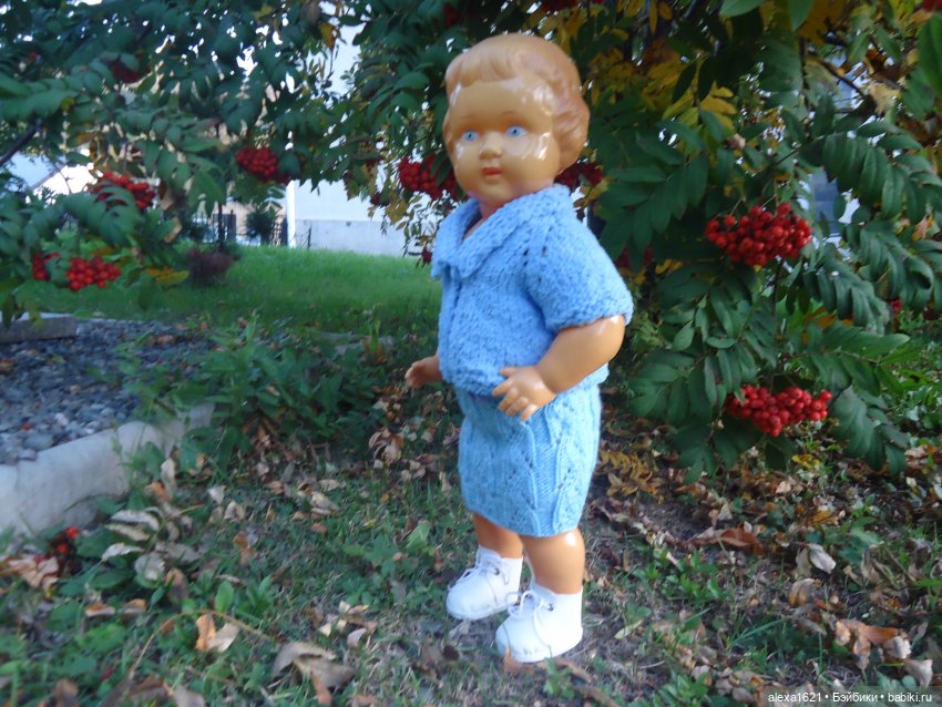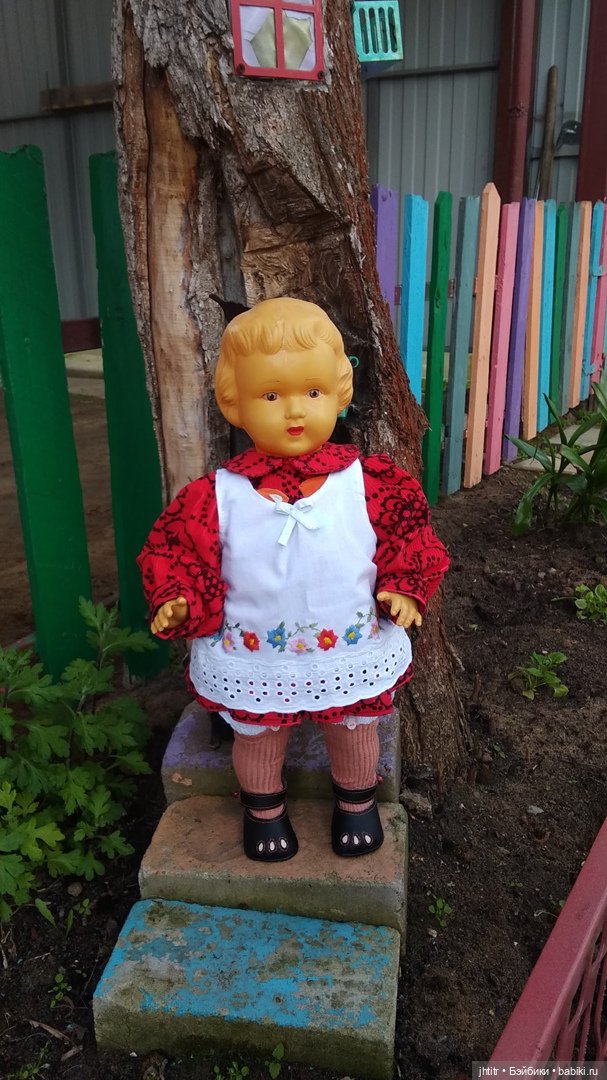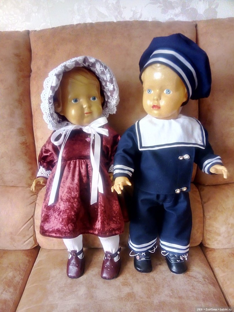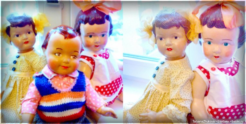 (Есть такой старый фильм „За витриной универмага“ реж. Самсона Самсонова, он 1955го года, там есть такие интересные кадры из магазина, где есть витрина с игрушками, так вот там и эти куклы, в том числе, на прилавке сидят) Ваша очень похожа именно на мою)