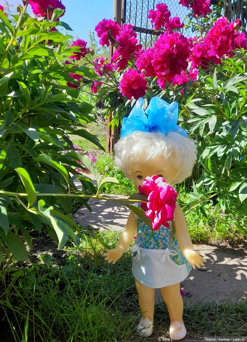 А солнышко припекает и Маринка поменяла свой бант на косыночку. Весело ей в пионах прятаться!
