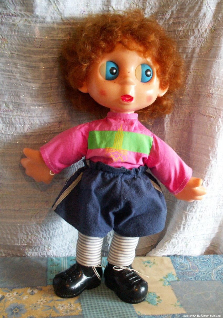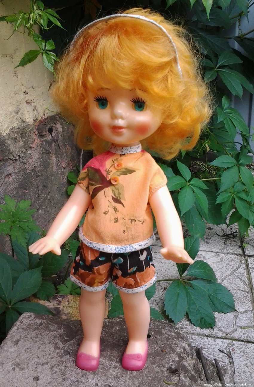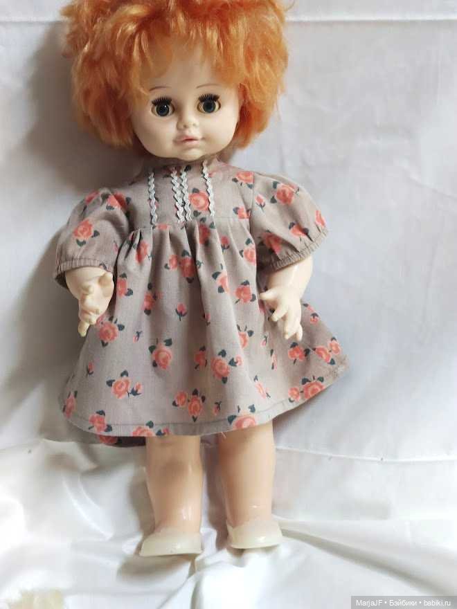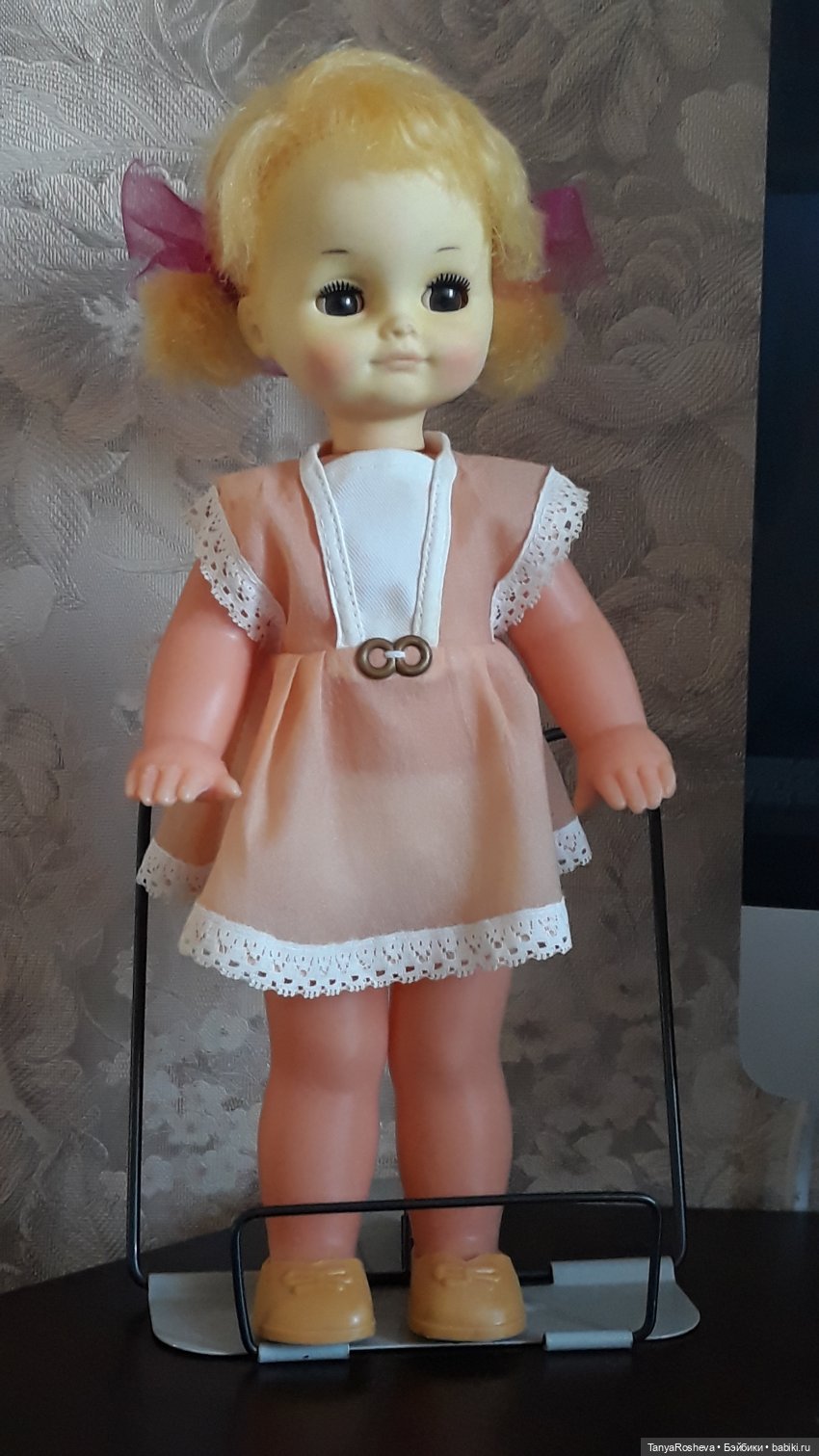 Это куколка Мстерской фабрики игрушек, которая была раньше во Владимирской области. Их очень много производили в 80-90-х годах с разным цветом волос и глаз, в разных одежках. Имена тоже у кукол были разные. Блондинки, по-моему — Анечки, а вот рыжики — не помню, возможно, Зои. Также эти девочки производились в нарядах по профессиям)