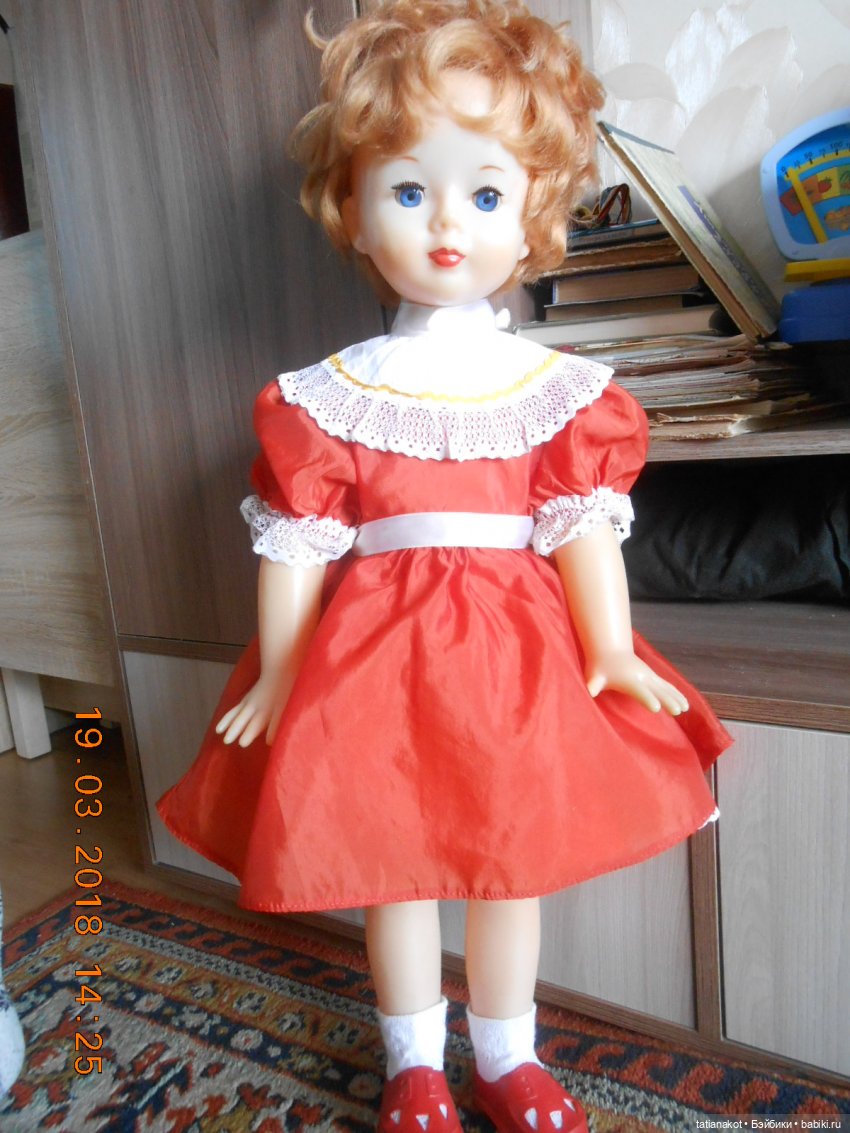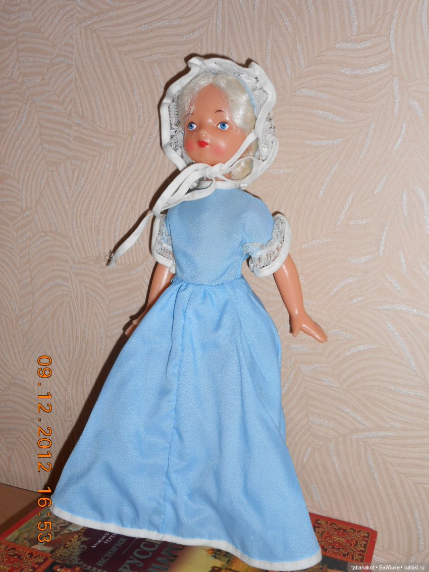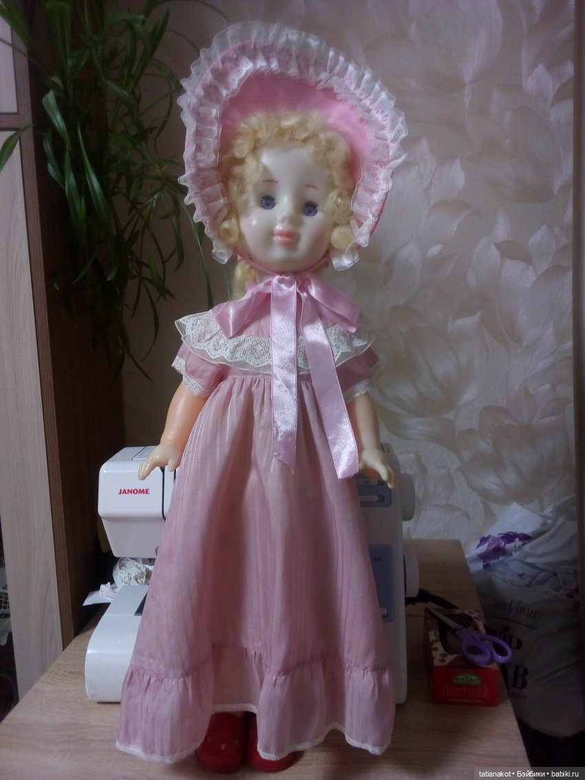 Наряд у девочки просто чудо! Представляете какое счастье было бы в детстве такую красавицу получить! Мало того что кукла большая (многие мечтали о больших куклах), так ещё вон какой многослойный наряд! Платье, нижняя юбка и боди. Тут можно столько игр придумать! Здорово!!! Выгорело правда всё — и куколка, и наряд. Ну всё равно — чудо как хороша!