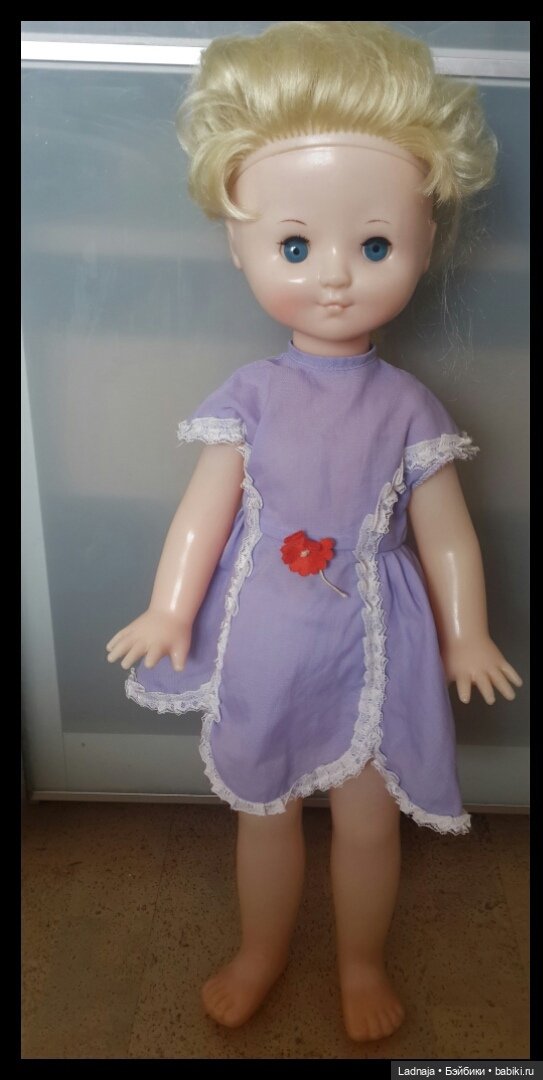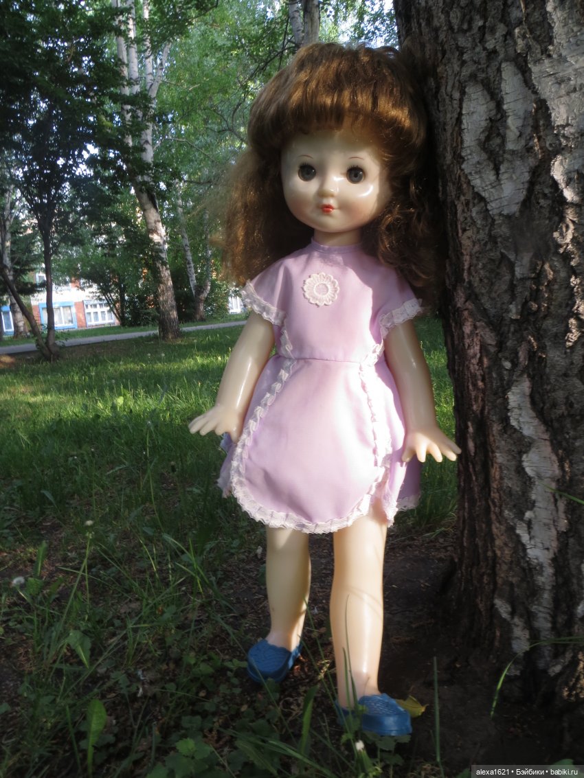как сейчас помню, у куколки были туфельки молочного цвета резиновые, как будто зашнурованные. Платье длинное до туфелек сиреневое в цветочек из ацетатного шелка, сзади прозрачные пуговки!
