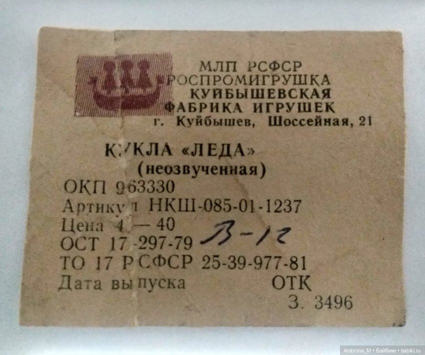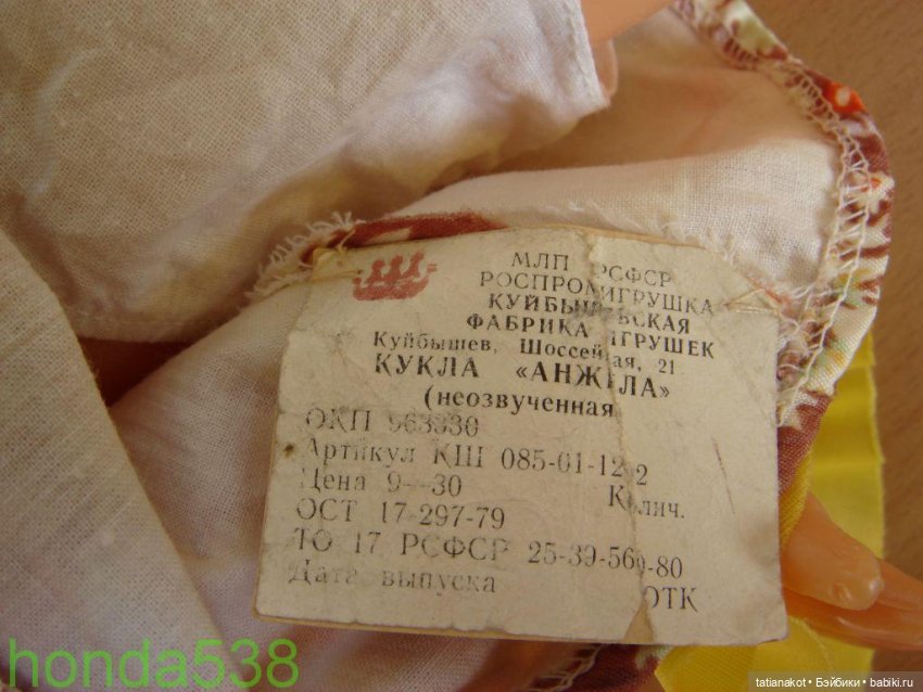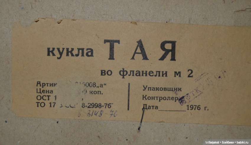 И еще один нюанс: смотрите внимательно, затерто или оборвано, но: ТО 17 УССР!!! Украинская республика-то!!! У них точно есть куклы с именем Тая, и кажется на двух разных фабриках такое имя встречалось. Фото с аукциона было опубликовано на ДП. Вполне возможно, что специально подстроено — с коробкой дороже ведь стоит! Так что версия с Таей неактуальна!!!