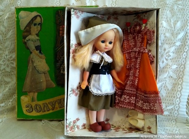Золушка. Краснодар, «Радуга», 35 см, конец 80-х.Была одета в темно-желтые костюм и шапочку, коричневые резиновые мокасины, а рядом- подарочек от феи — белое бальное платье и белые туфельки (на ней))