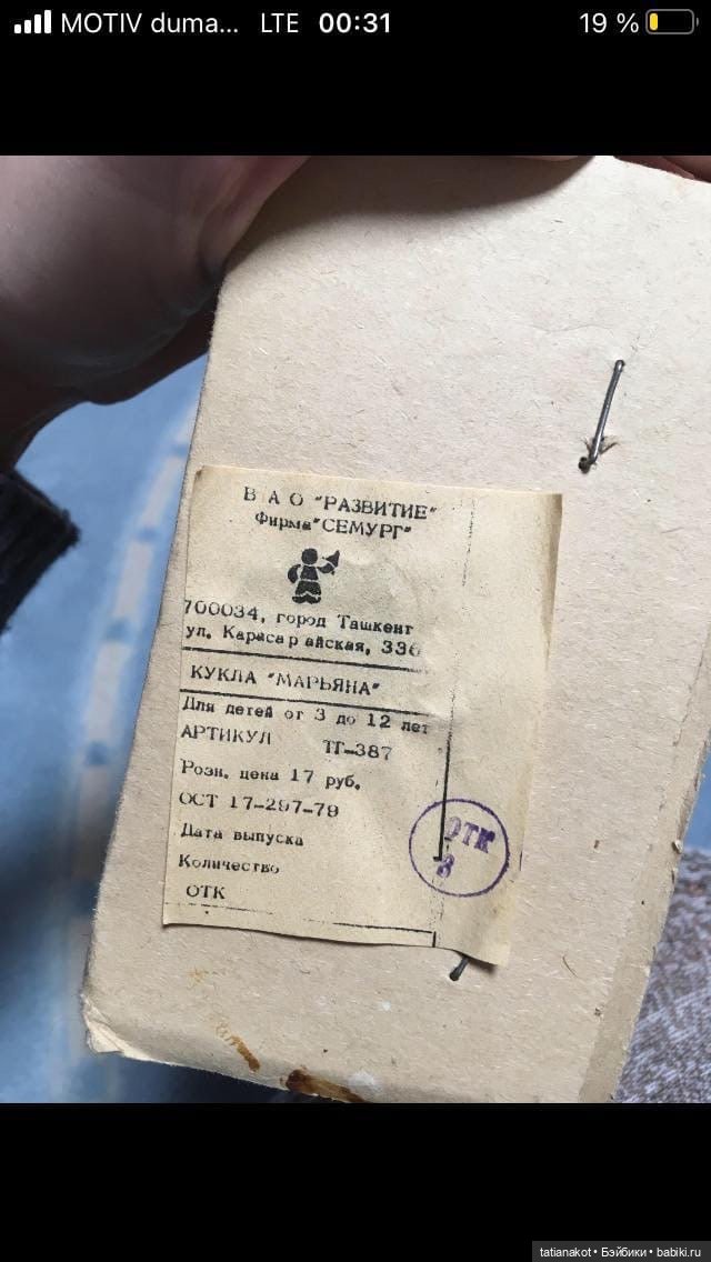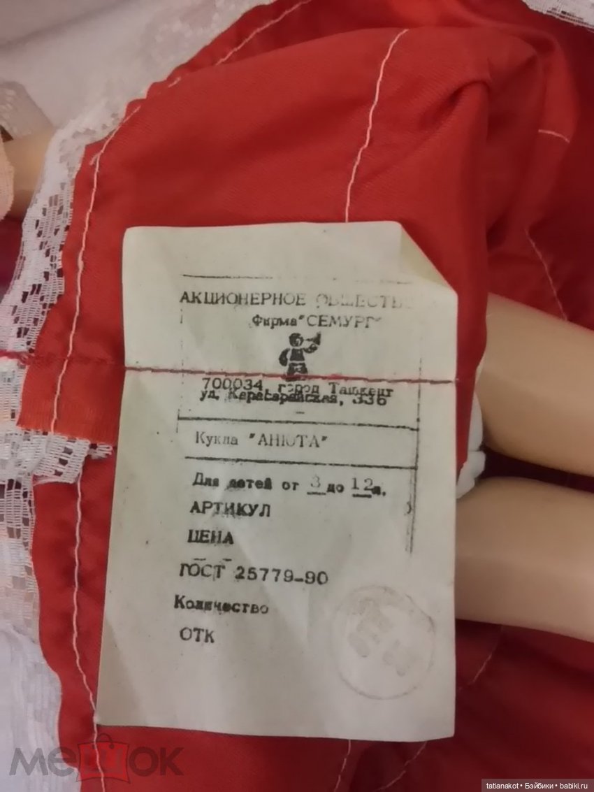 На куклах часто встречаются ценники — ЗАО «Развитие», фирма «Семург» 700034. И клеймо «Ташигрушка». Возможно, это филиал или второй цех фабрики «Ташигрушка».