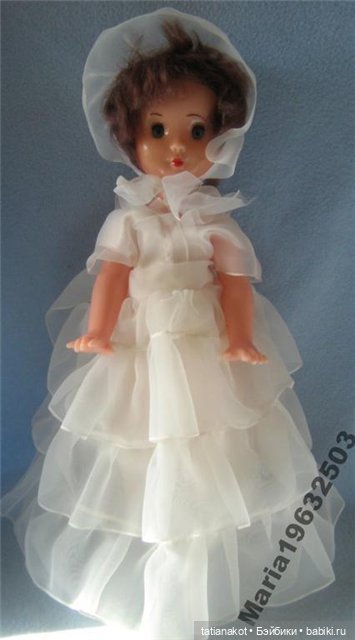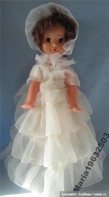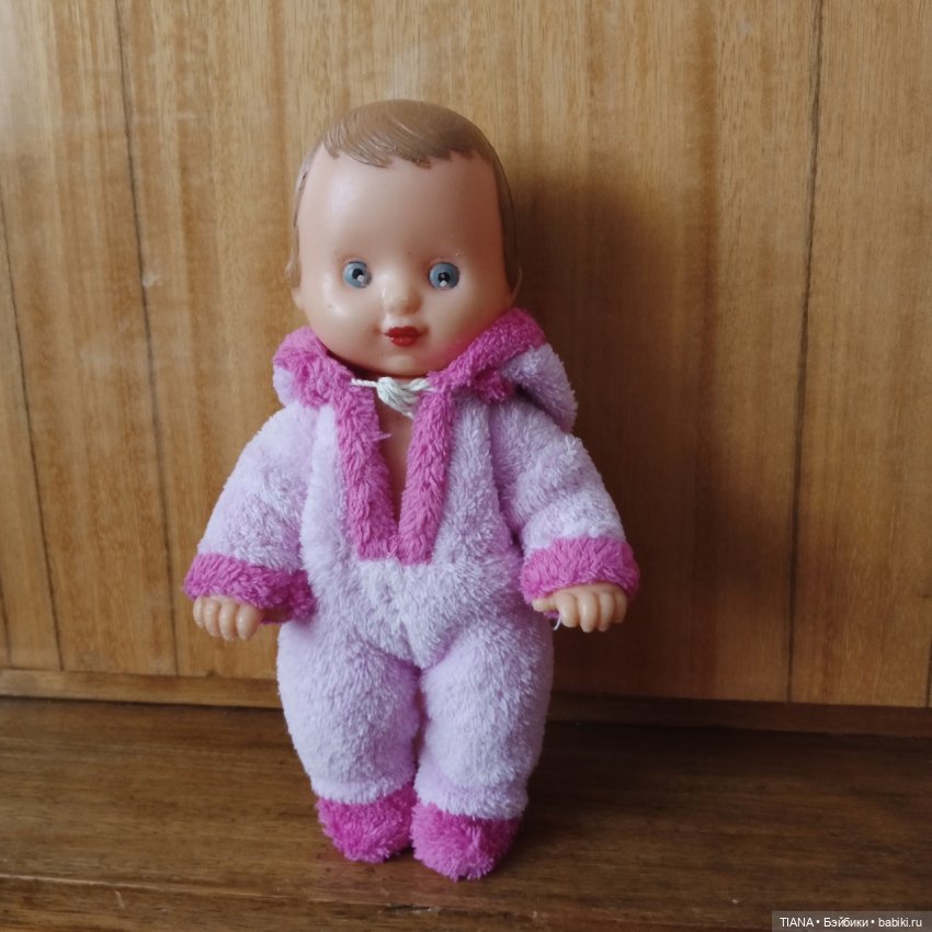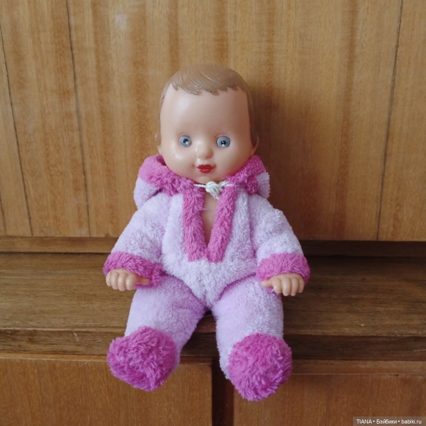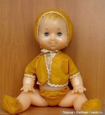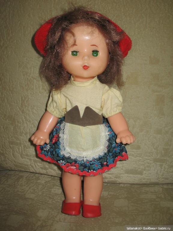 А ещё есть куколка как у вас на последних фотографиях, только не со светлым волосами, а с тёмными, коричневыми. И это мальчик, потому что в штанах. Правда, одежда не сохранилась. У него была бежевая рубашка, коричневые атласные штанишки на резинке и фетровая серая шляпа, как у Незнайки. Туфельки белые, пластмассовые вроде были, а может и полупрозрачные полиэтиленовые. Я звала его Алёшей, возможно, это и было фабричное имя.