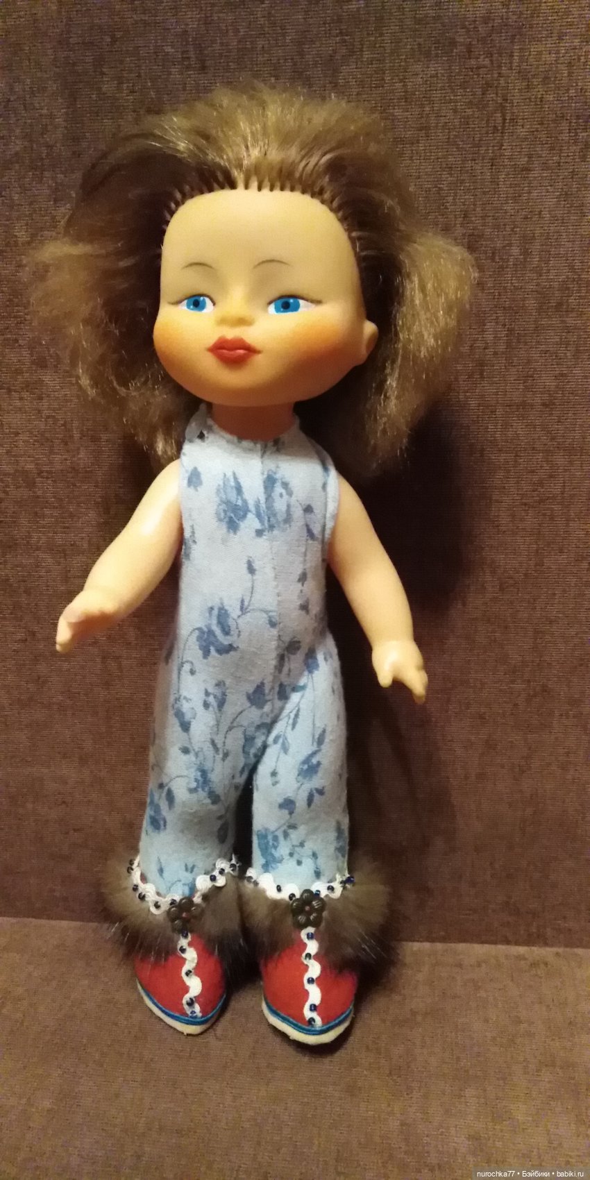 Желаю чудесного настроения всем заглянувшим к нам в этот последний зимний вечер. Сегодня в главной роли топика выступает очаровательная кукла советского периода — Кира фабрики Кругозор. У меня эта брошенка поселилась давно и смиренно ждала своего часа голышкой в шкафу за стеклом, она приехала ко мне от моей подруги Лели. Как то пару лет назад в одной группе в ВК проходил совместный пошив наряда Северянки. Я загорелась одеть Киру северянкой, у неё такие милые узенькие глазочки! И даже пыталась что то кроить на неё. Но как обычно у меня бывает-отгорело, отболело. Наряд оказался в комоде в режиме ожидания. Осенью в отпуске я его нашла, покрутила в руках и поняла, что это никуда не годится-вероятно куколка выросла🤣🤣🤣, раз оно стало мало. И выкроила новое пальто, но шить решила уже другое. Как то в шопике промелькнула похожая Кирочка в родном наряде. И работа закипела. Из винтажного алого кашемира сшила пальто, сапожки — а-ля-унты, оторочка — натуральный мех норки(из советской шапки) и винтажная тесьма вьюнок, комбинезончик из трикотажа и украшение на головочку. Сама куколка прошла банные процедуры, чуть — чуть позагарала на окошке в базироновой маске, получила в награду несколько прядок недостающих волос, яркий румянец на щечках и сочный цвет пухлых губок, ну и немножко поколдовала над одним пальчиком, он был покусан. Нарастила его акриловым гелем. В остальном девочка была почти идеальна для своих лет. Увы, я не сделала фото Кирочки ДО. Сначала покажу фото, которое меня вдохновило (скопировано из шопика, по требованию хозяйки удалю)