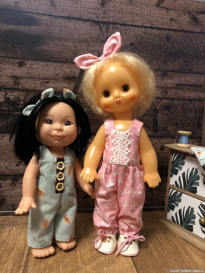 Очень понравился необычный «шуршащий» костюмчик! Но очень непривычны были рыжие волосы. А дальше сидели куклы с желтыми волосами (мне хотелось с желтыми), но вот одежда на них была другой. Тоже «шуршащий» фиолетовый комбинезон (брюки с грудкой) и белая трикотажная кофточка в синюю крапинку. Я с детства любила, чтобы все подходило и поэтому сочетание фиолетового и белого в синюю крапинку не пошло…