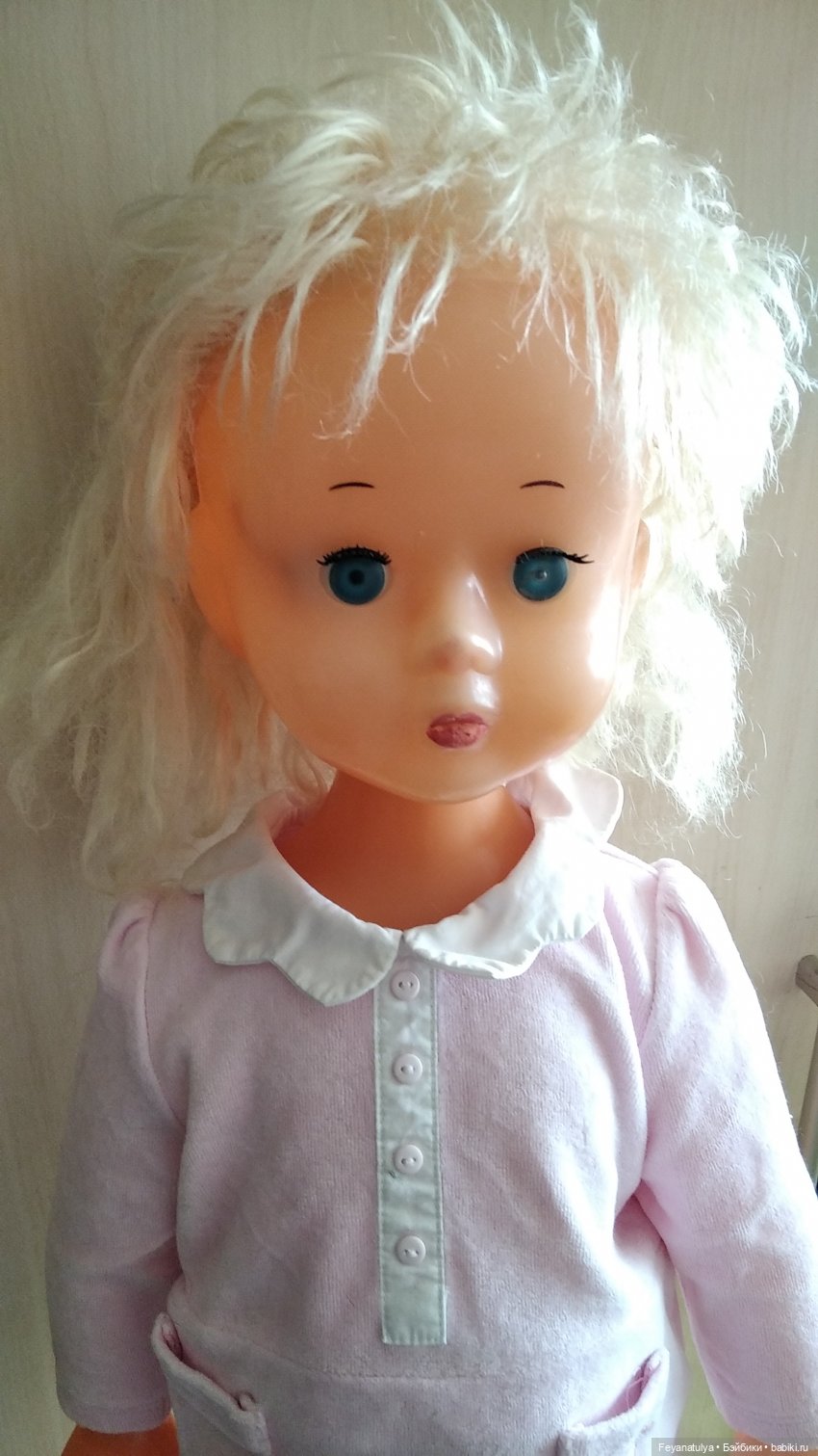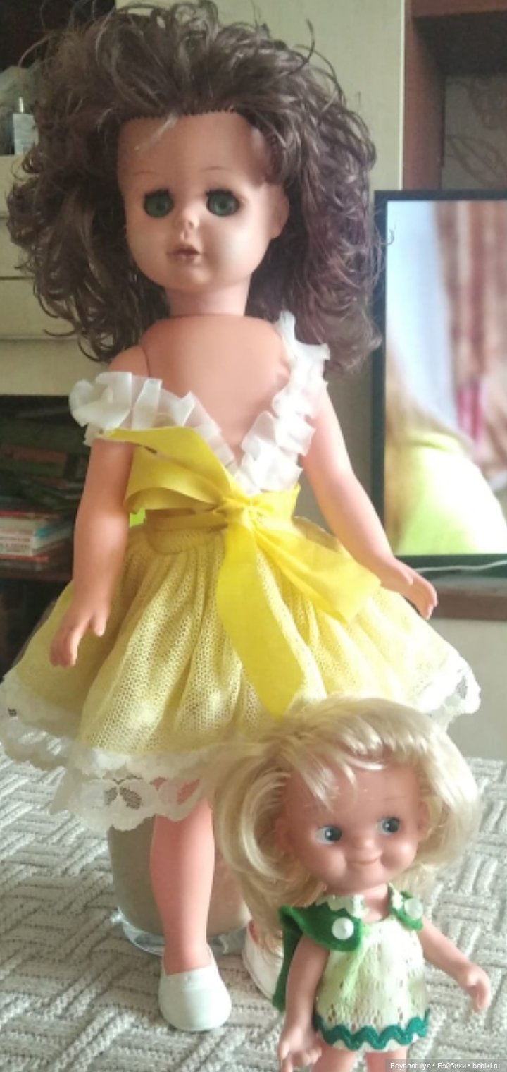 Решила узнать подробнее, прицениться. Оказывается, это Днепропетровская кукла и цены на неё ого-го. Долго металась, жалко выкладывать такую сумму за 44 см пластика. Но никак не шла куколка из головы. Вздохнула и купила. Теперь нисколько не жалею. Вместе с ней покажу ещё несколько винтажек, что живут у нас дома. Приводите и своих винтажек в гости