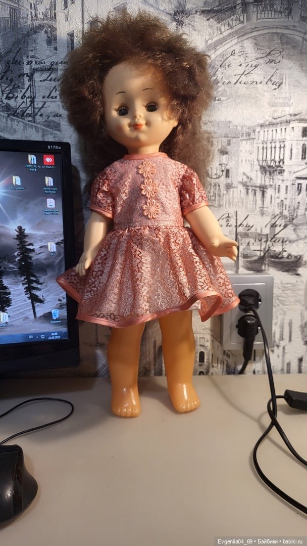 А вот ещё одна Женя пока не обрела наряда, подходящего её возрасту и статусу. С другой стороны, все эти советские куклы были игровыми, а многие так и вовсе заигранными. Туфельки терялись, родное платье либо терялось, либо приходило в негодность от частых переодеваний. И девочки шили-вязали кукольные костюмы, как могли.