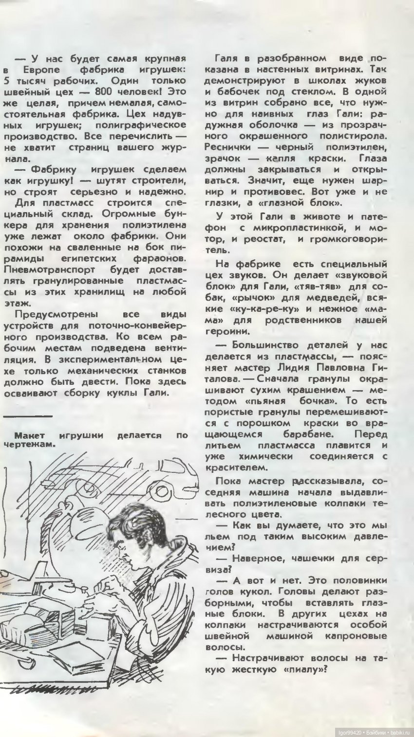 Возможно, вы эту публикацию встречали. Кукла Галя не фантастика, я в одной командировке встретил людей с этой фабрики, они мне подтвердили, что такая кукла у них в самом деле изготавливается.