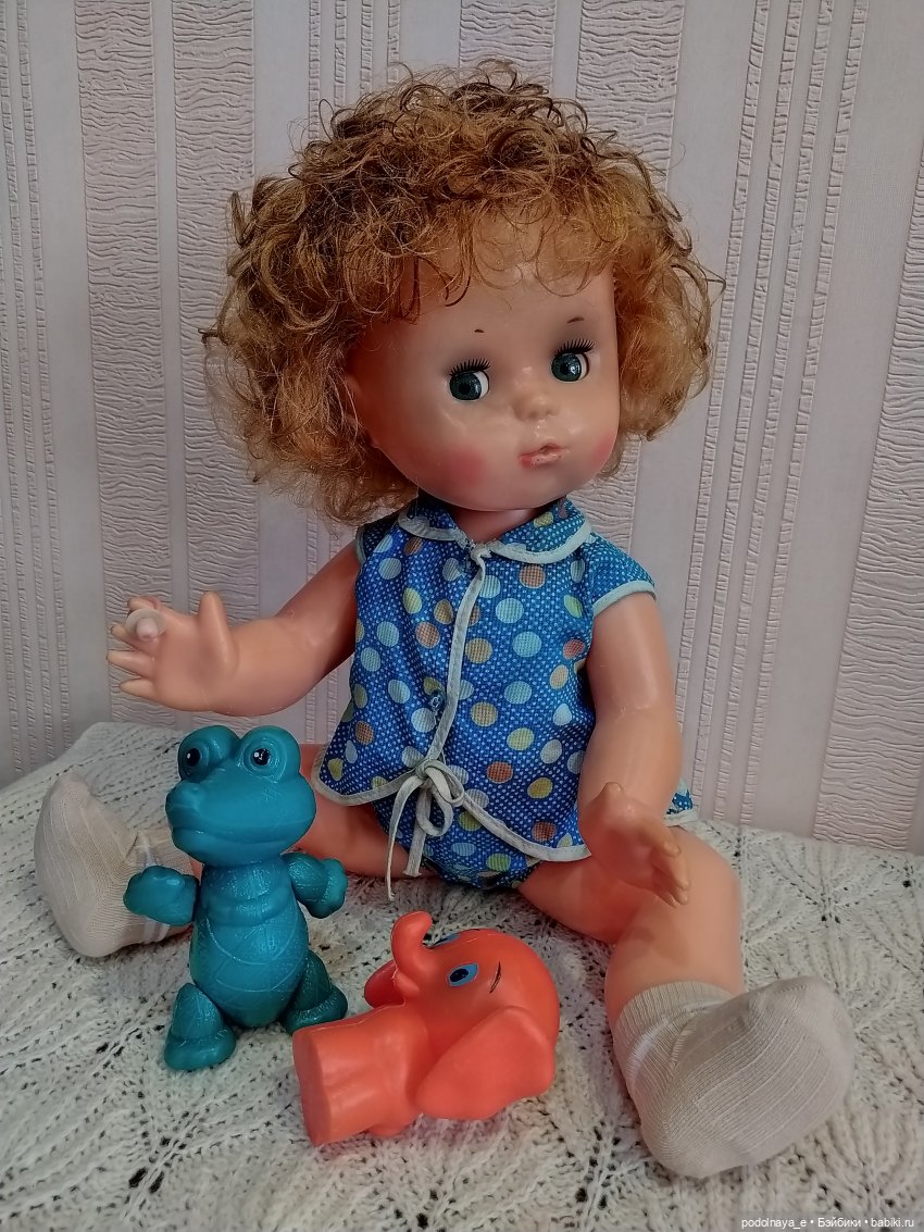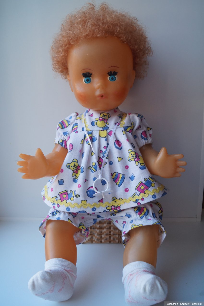 Не знала, что её Наташей зовут.Была почти такая в детстве, я в коляске её катала и соску постоянно снимала и водичку туда подливала в дырочку… ох сколько же она её выпила))Но т.к. кукла стоять не могла сама и была большого размера интерес игры с ней угас. В последствии, просто сидела на полке с остальными куклами, а потом кому то была подарена.У неё действительно были трусики как на Вашей из шёлка и платьеце коротенькое из такого же шёлка.