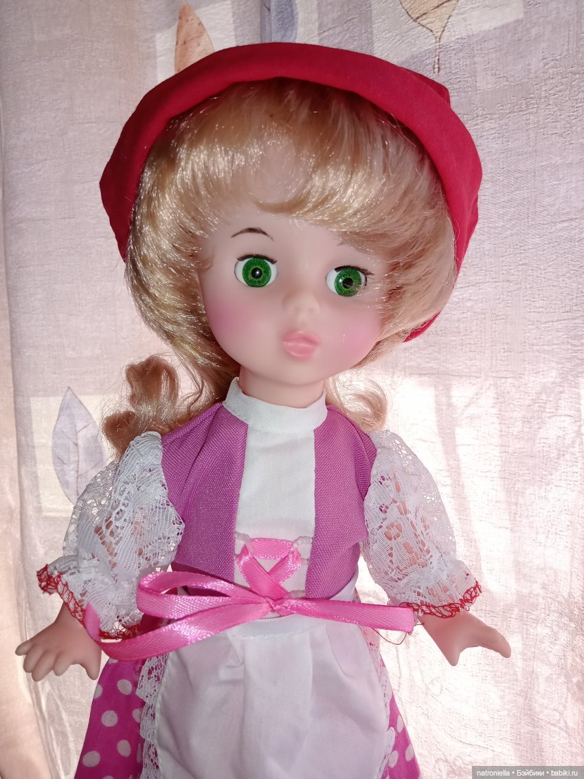 Вот это точно Люся. Была в родном наряде, но наряд этот настолько невзрачен — микро-платье из серовато-синей синтетики на ленточках — что я сразу убрала его с почестями в пакетик и сшила по его образцу наряд повеселее. Ну и чепчик добавила, это уже отсебятина, люблю чепчики Золушек, а тут как бы панамка будет. Туфельки подбор, от другой советской куклы.
