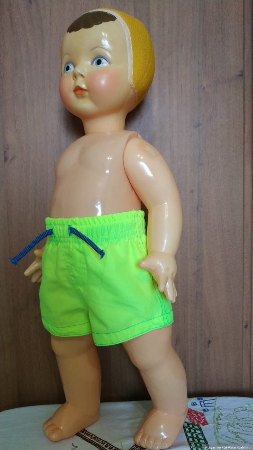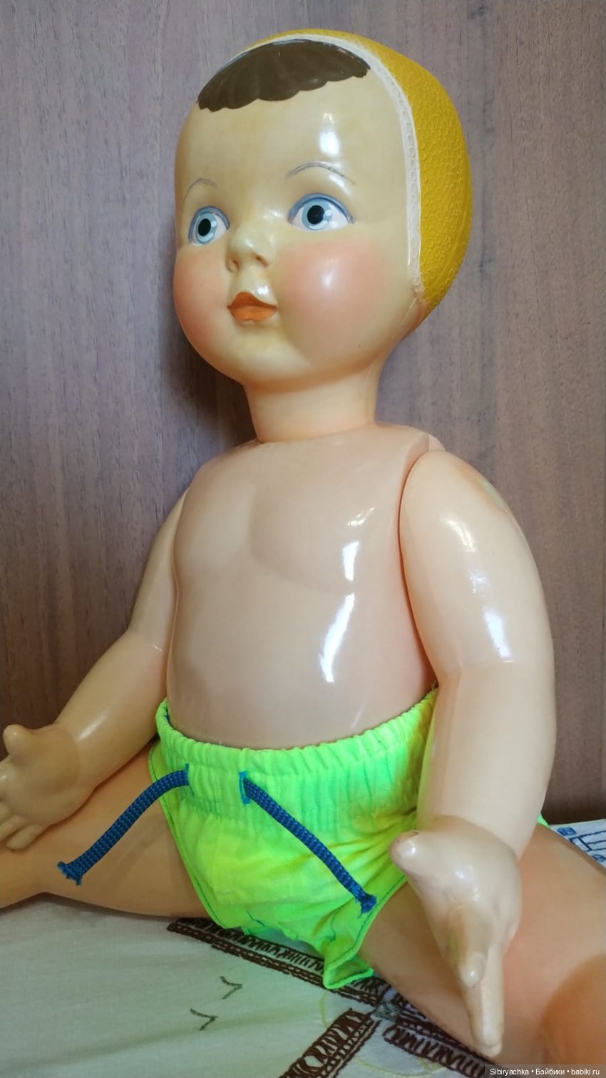 Героиня нашей публикации — крупная девочка, её рост 65 см. По фабричному названию очень легко догадаться о её любимом виде спорта. На голове у неё рельефная формованная шапочка, вылитая вместе с куклой из целлулоида. Шапочка с головы куклы не снимается. Мне очень нравится рельефный рисунок на шапочке. Из-под шапочки выбивается забавная чёлка, которая обязательно намокнет в бассейне.