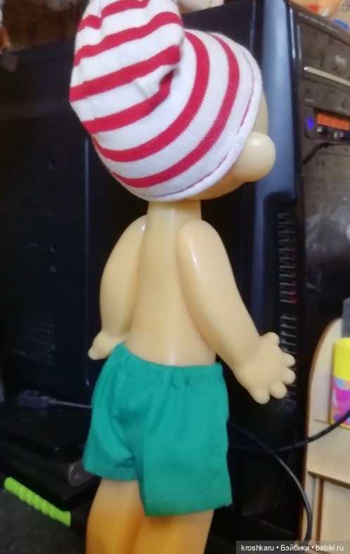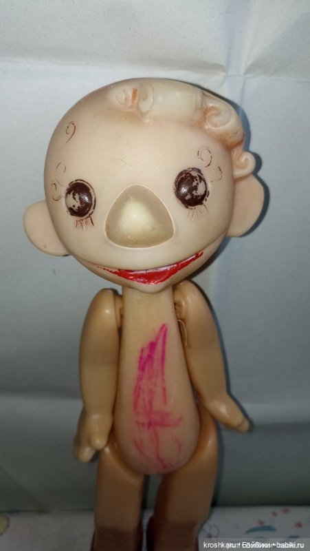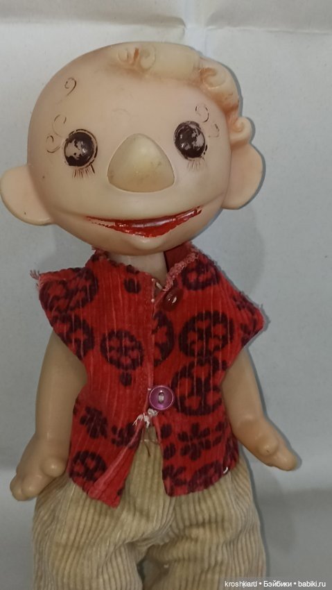 Да, этот парень похоже действительно выпускался у нас, в Новосибирске. Я его хорошо помню, но не в одежде. Любимец мой был в детстве. Купила здесь, на Бэйбиках. Так-же, как вы решила, что если не сейчас, могу не купить вообще. Отмылись-пошлифовались-покрасились, и вуаля. Только рубаху сшить осталось, с воротничком) :