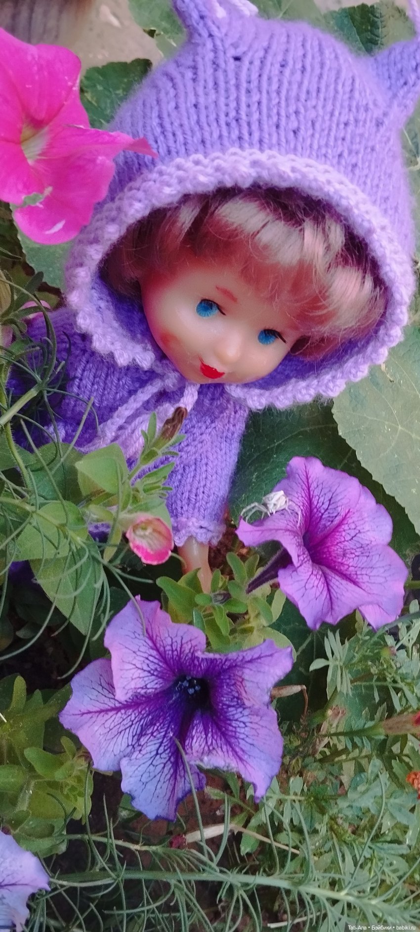 Столько всего примерила, платьца, комбинезончики, костюмчики и все ей не нравилось. Я не девочка-припевочка, я озорница и непоседа, говорила она. И вот однажды, посадив Киру рядом, я взялась за спицы. Под ее контролем и с постоянными советами, наконец-то появился наряд, который ей пришелся по вкусу.