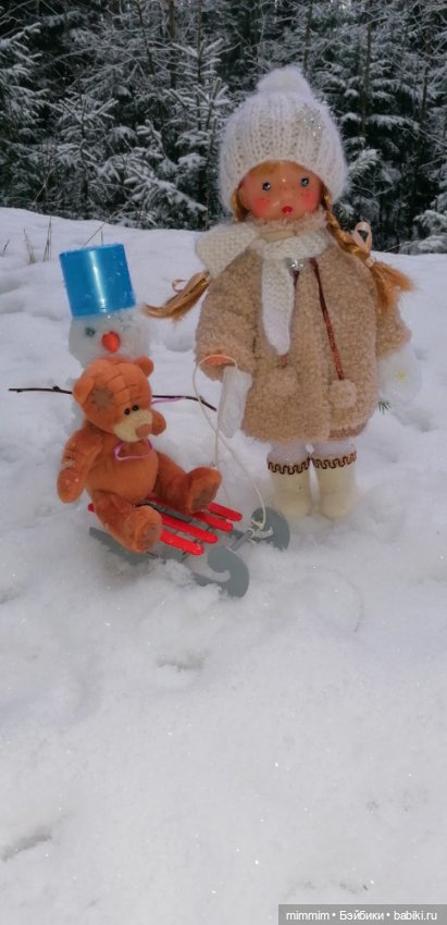 Замечательная фотография: и девочка в шубке, и снеговик, и мишка на саночках!