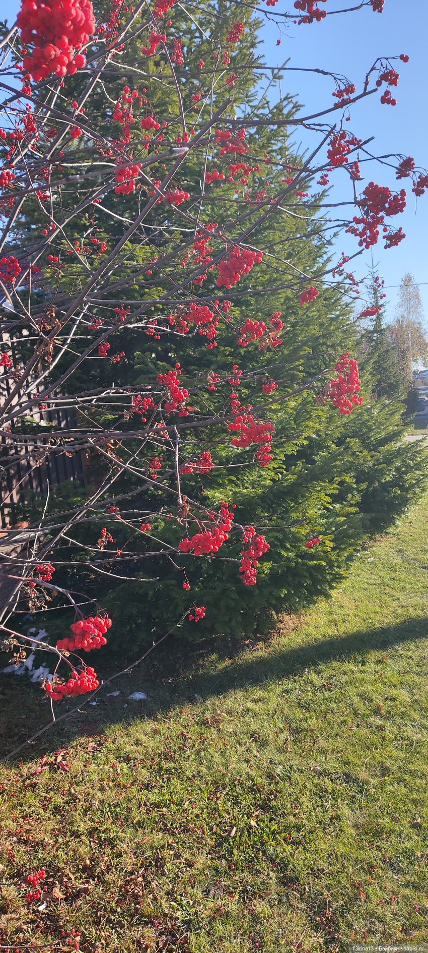 Выходим из дома и видим огромные кусты рябины, на самой верхушке которых красуются тяжёлые грозди красных ягод. Совсем рядом кусты калины, на которых ещё тоже много ягоды.
