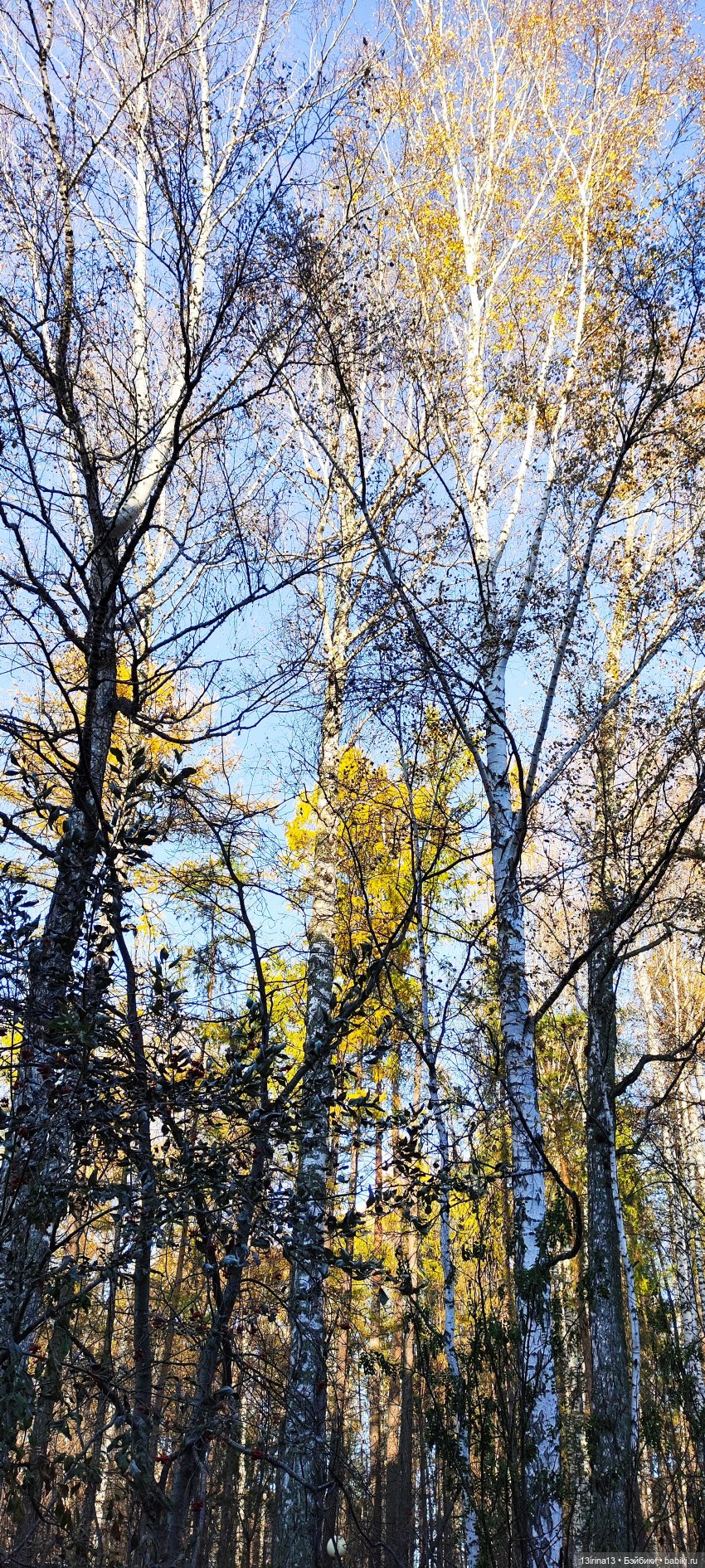 Берёзы всё ещё стоят в золотом наряде на фоне ярко-синего октябрьского неба.