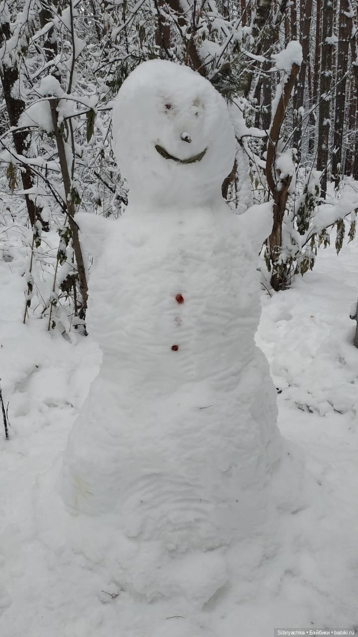 Юляшка увидела огромного снеговика, который всем улыбался и приглашал прогуляться по сибирскому лесу.