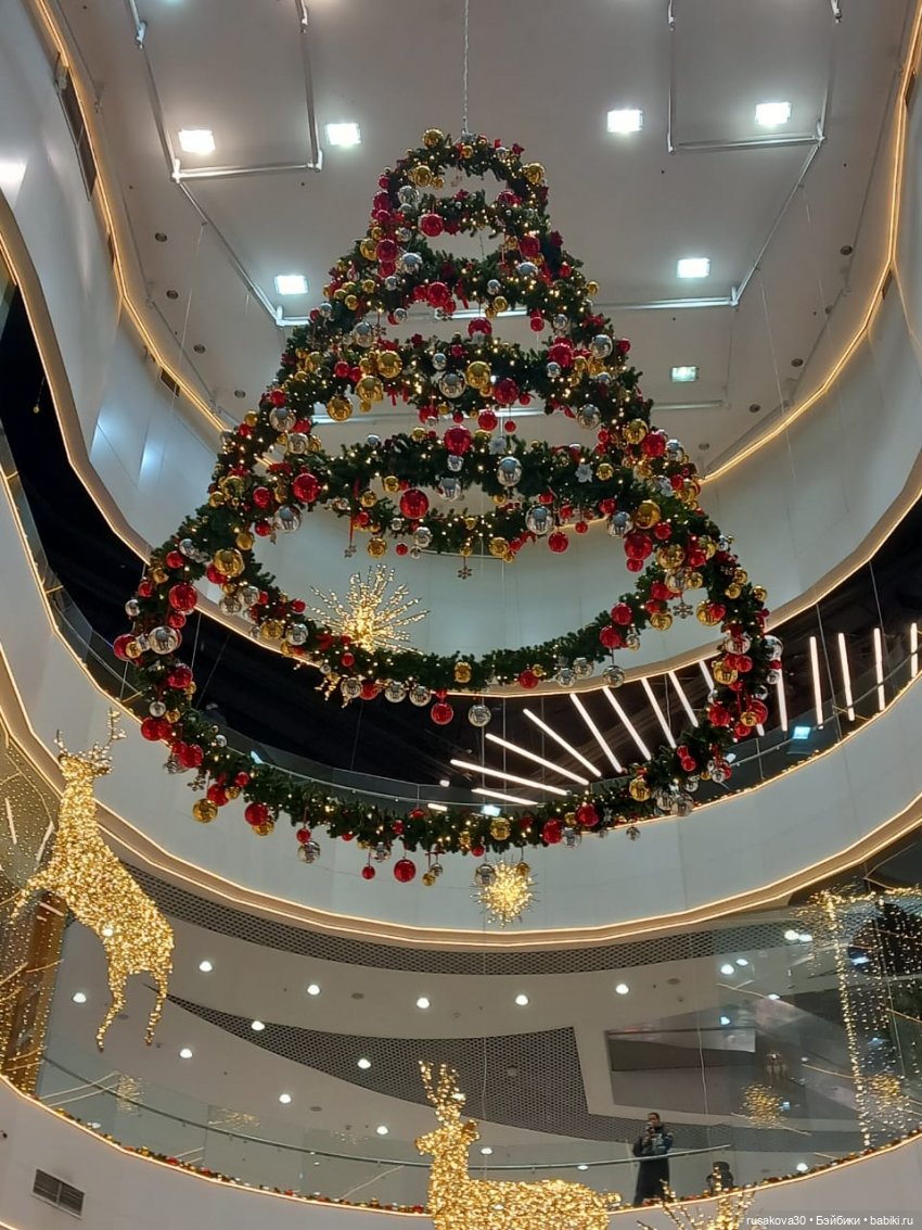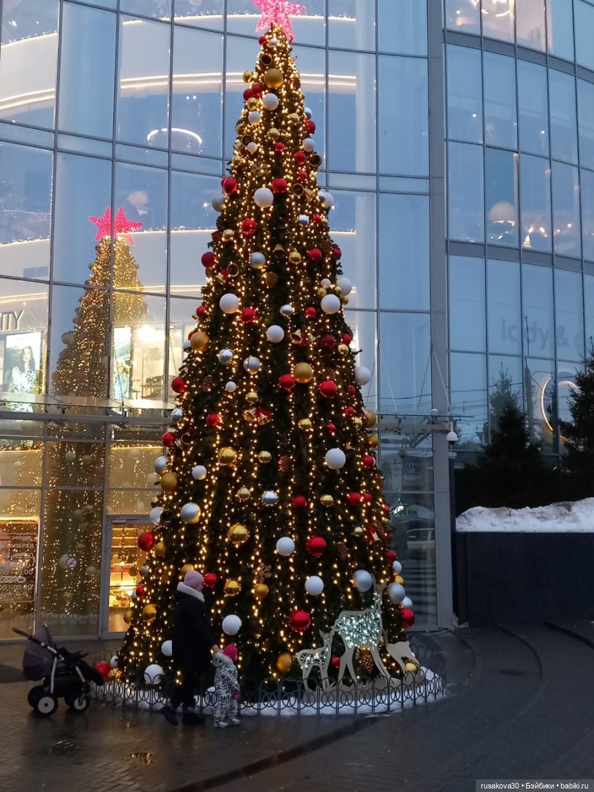 На первом этаже торгового центра стоит высокая ёлка, украшенная гирляндами и чудесными игрушками.