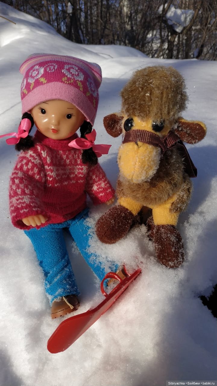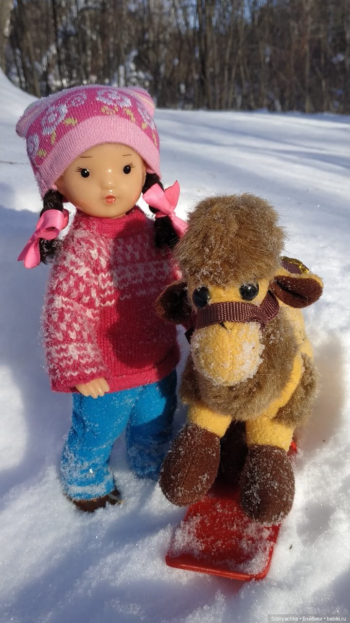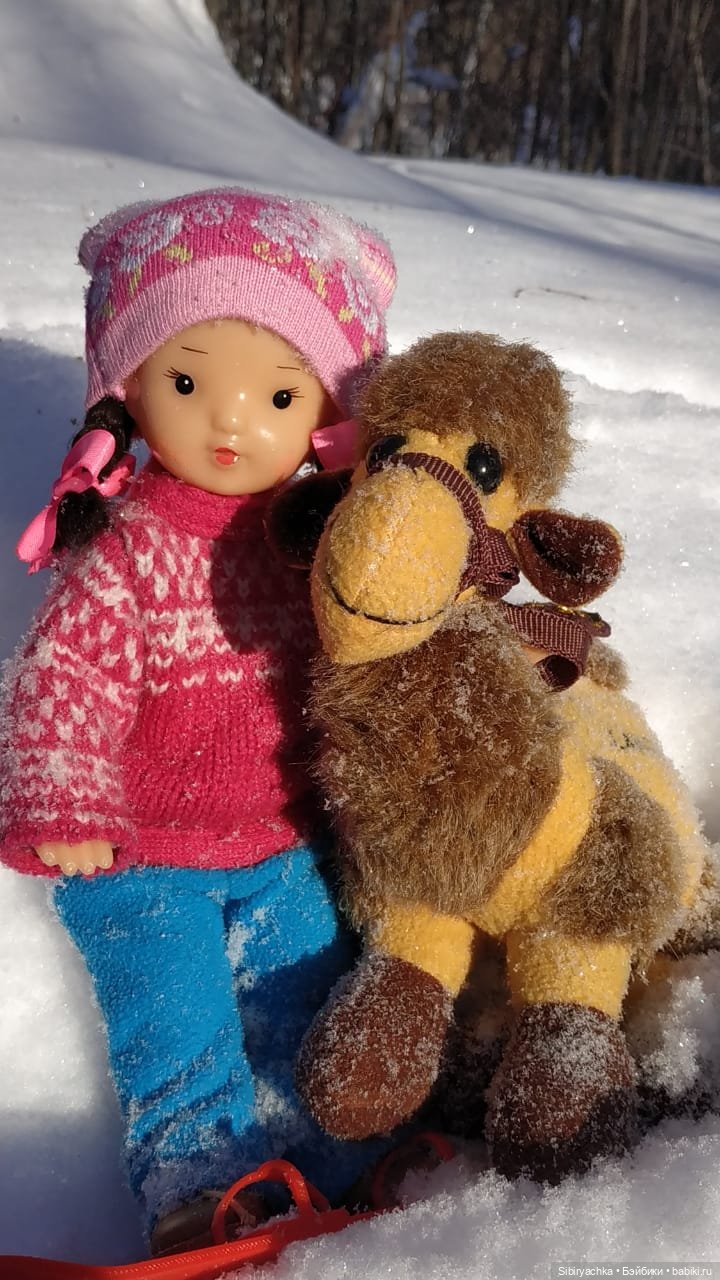 Юляшка пытается застегнуть крепления сноуборда, а верблюжонок очень удивлён всем, что происходит вокруг него.